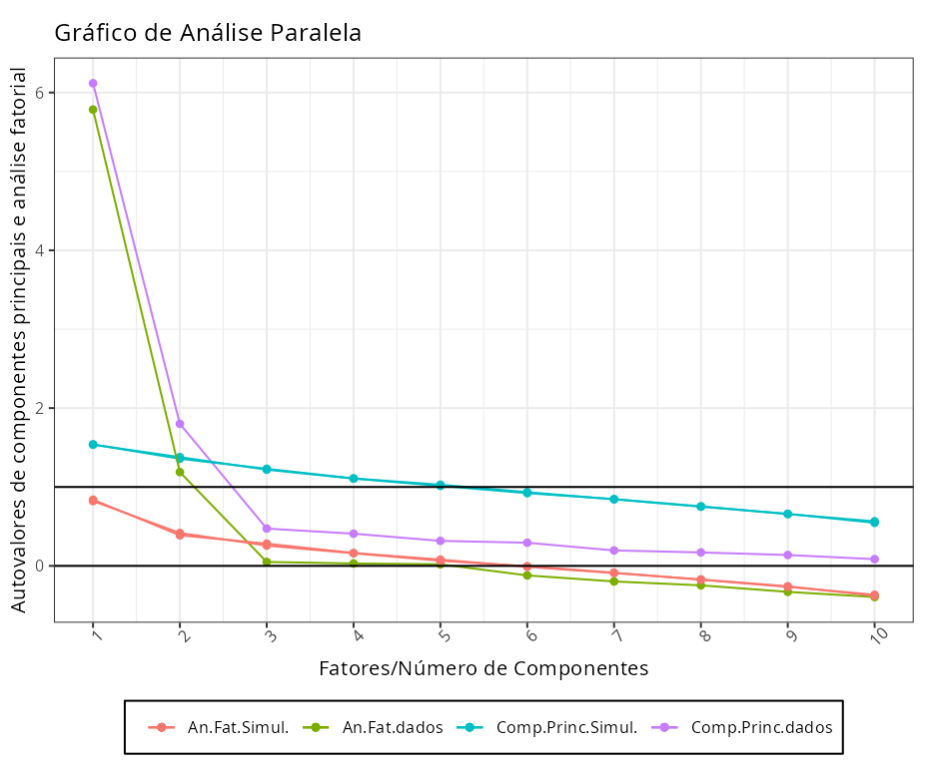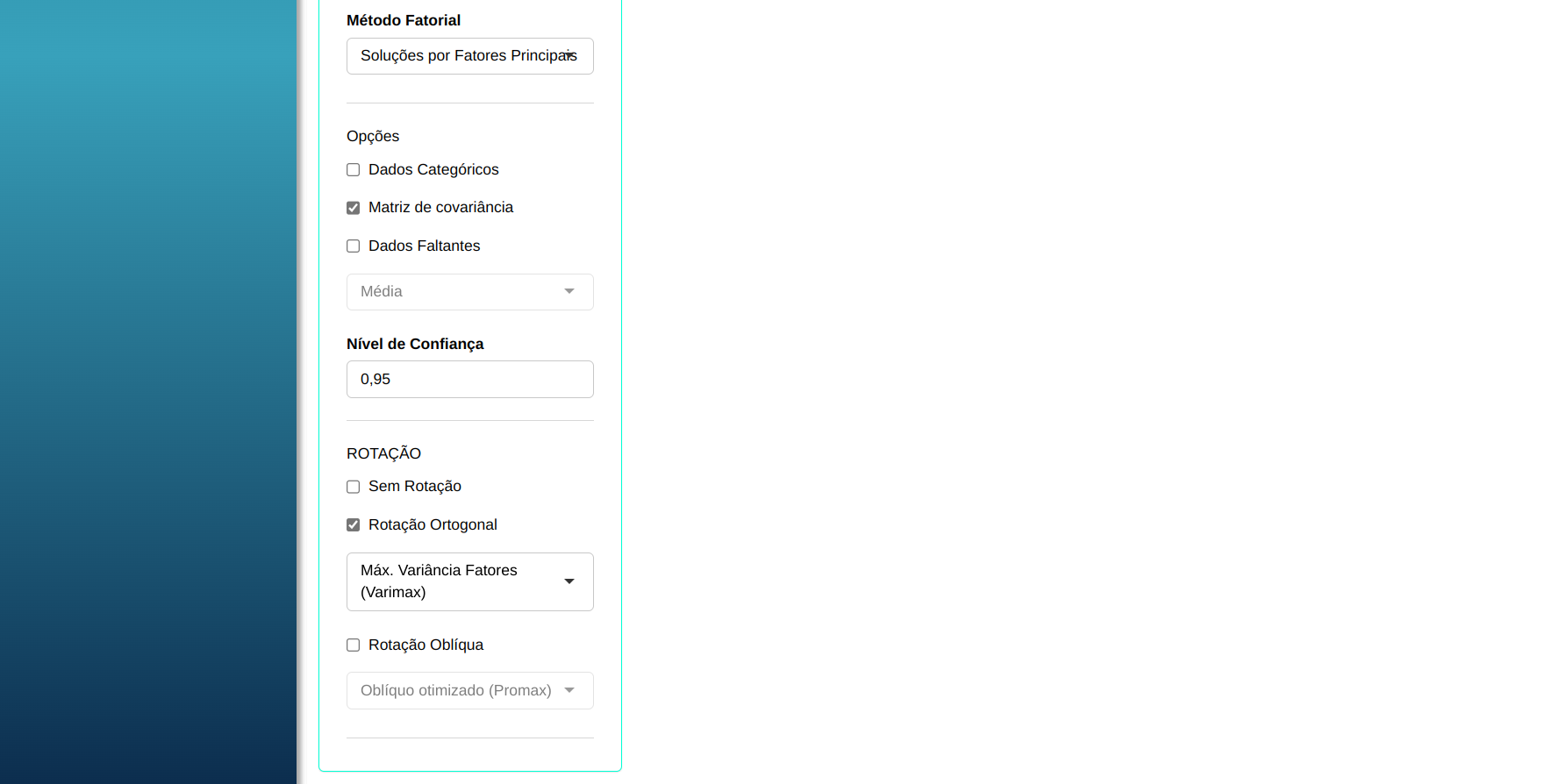 | Dados da Análise Fatorial | Dados simulados da Análise Fatorial | Dados dos Componentes Principais | Dados simulados dos Componentes Principais | Unicidade (Uniqueness) | Comunalidade | Cargas | |