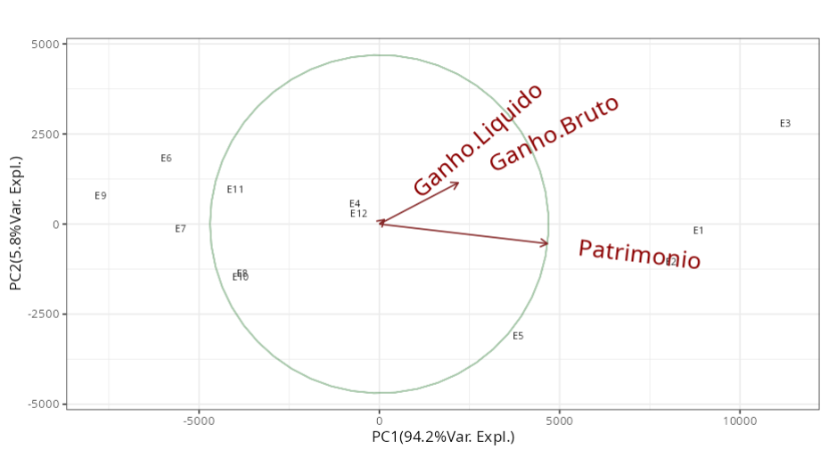 Assim, a primeira componente pode ser interpretada como um índice de desempenho global das empresas. Como os pesos são negativos, quando maior for o ganho bruto e o patrimônio da empresa, menor é o valor dessa componente e melhor é o índice global de desempenho da empresa. As empresas E3, E1 e E2 tiveram os melhores índices de desempenho, respectivamente, enquanto a empresa que ficou com o pior índice foi a E9.