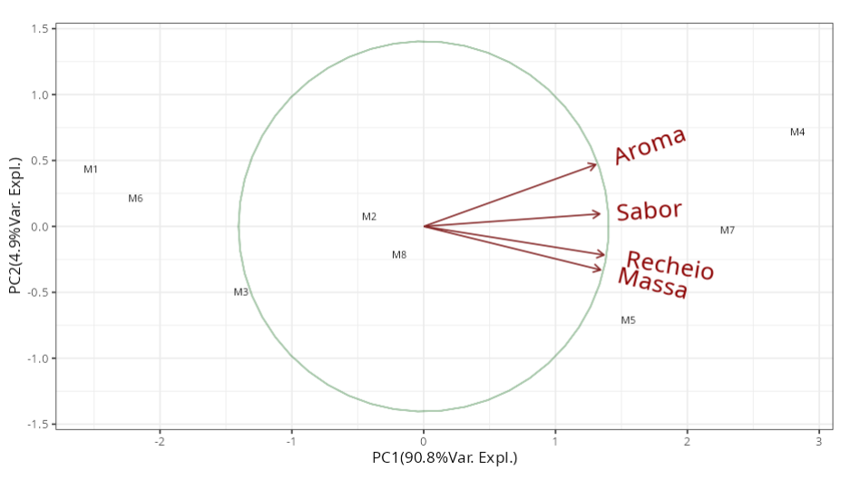 Assim, escore mais baixo na primeira componente indica que o índice de qualidade é melhor, ou seja, quanto menor o escore dessa componente, melhor é a coxinha. De acordo com a tabela de escores obtida nessa análise, as marcas M4, M5 e M7 possuem as melhores coxinhas enquanto que a pior coxinha é da marca M1.