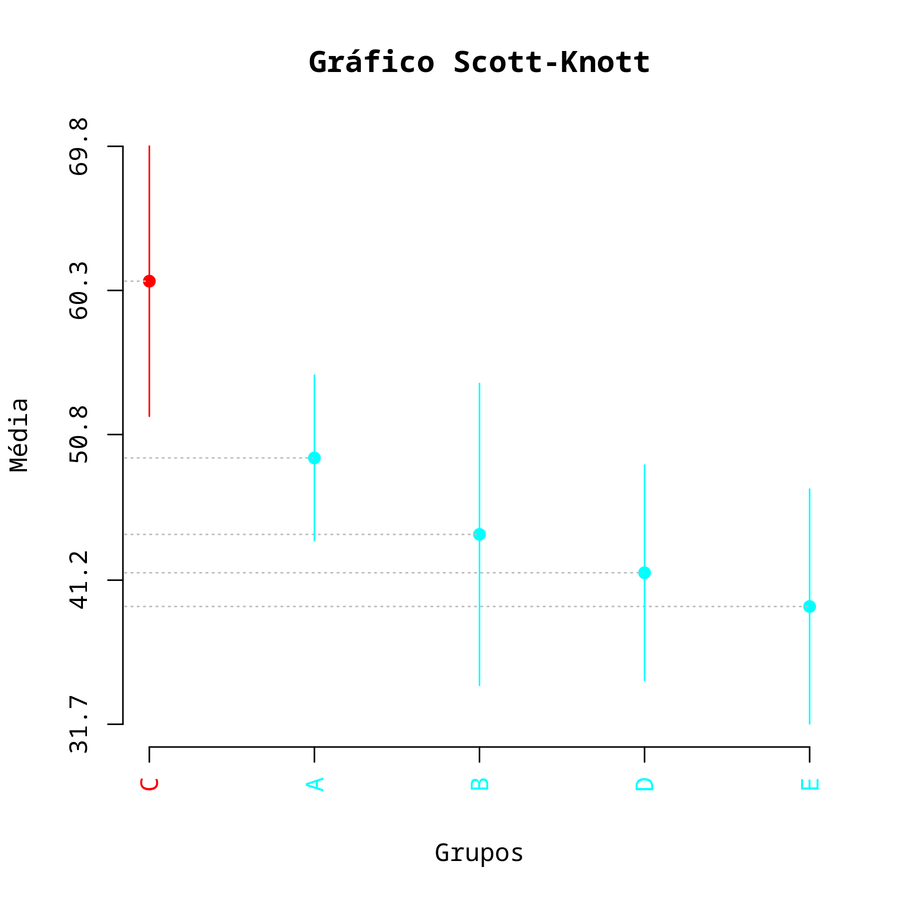Pela análise de Scott-Knott, pode-se ver que os cinco tratamentos podem ser agrupados em apenas dois grupos. Um grupo contendo apenas o tratamento C e o outro contendo os tratamentos A, B, D e E.
