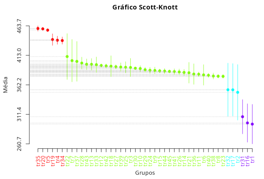 Segundo a Análise de Scott-Knott ao nível de 95% de confiança, todos os 45 tratamentos podem ser divididos em 4 grupos distintos, como mostra o gráfico Scott-Knott da Figura acima.