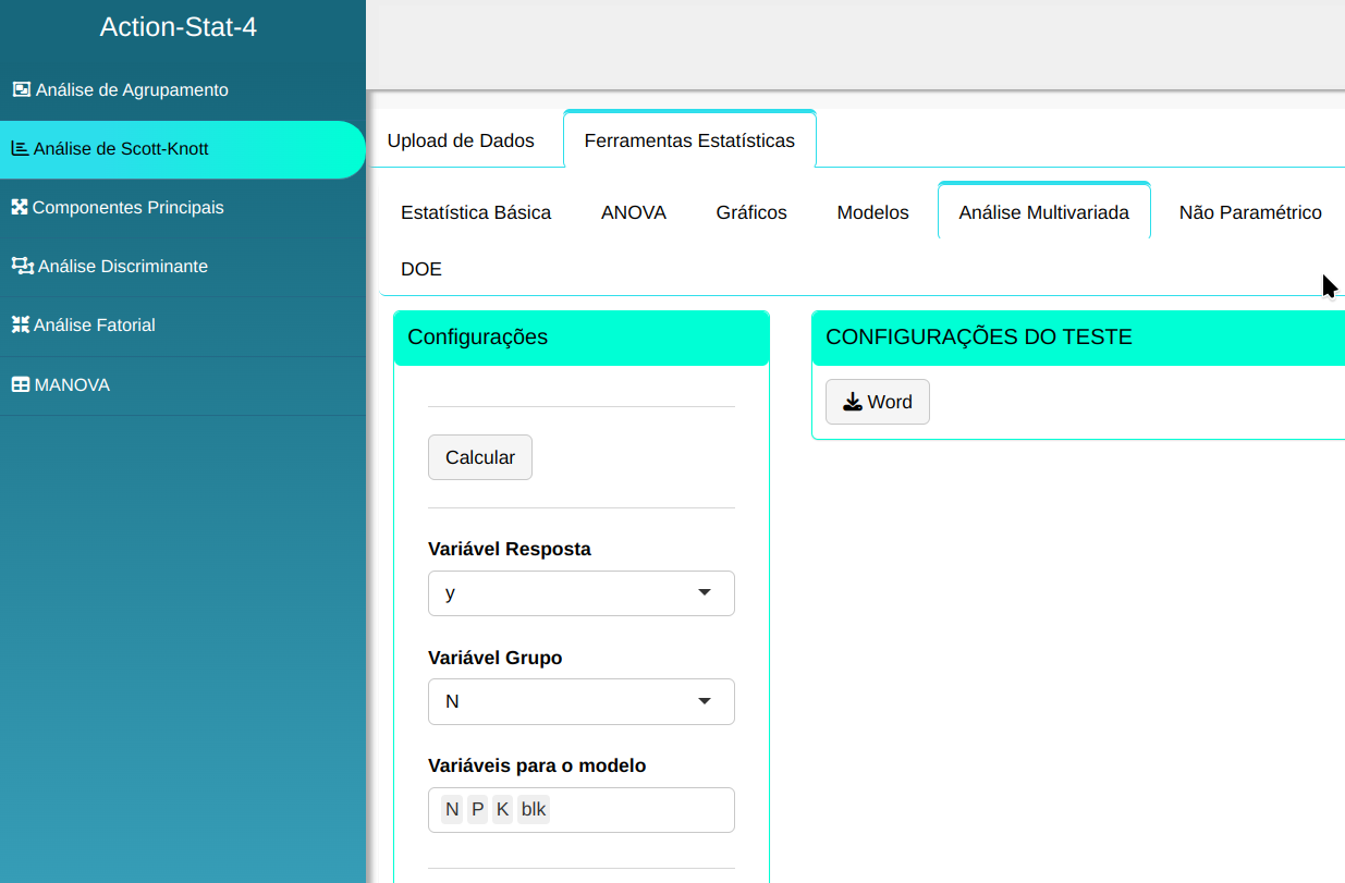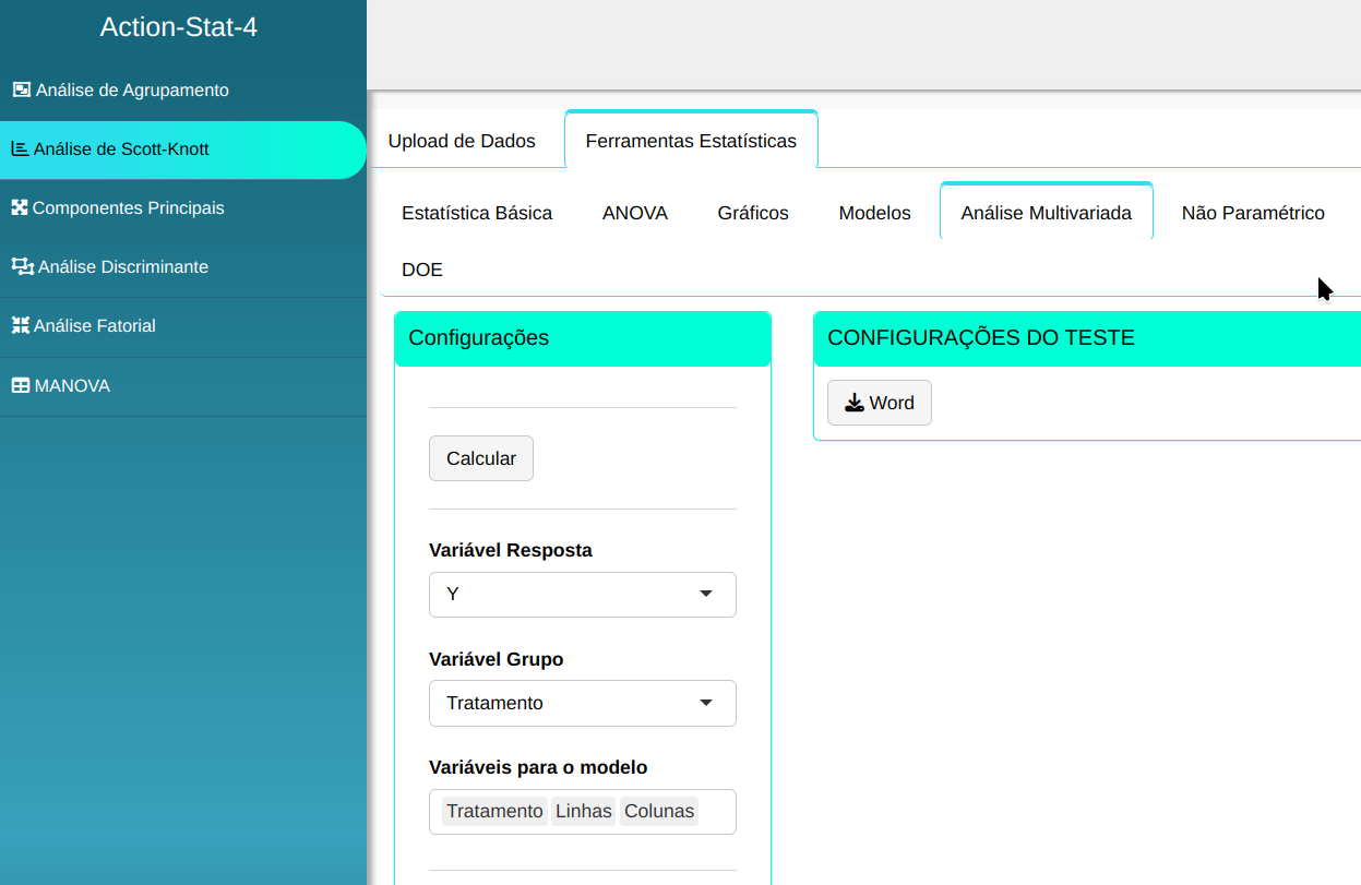 A análise de Scott-Knott será realizada com as configurações apresentadas na figura abaixo.