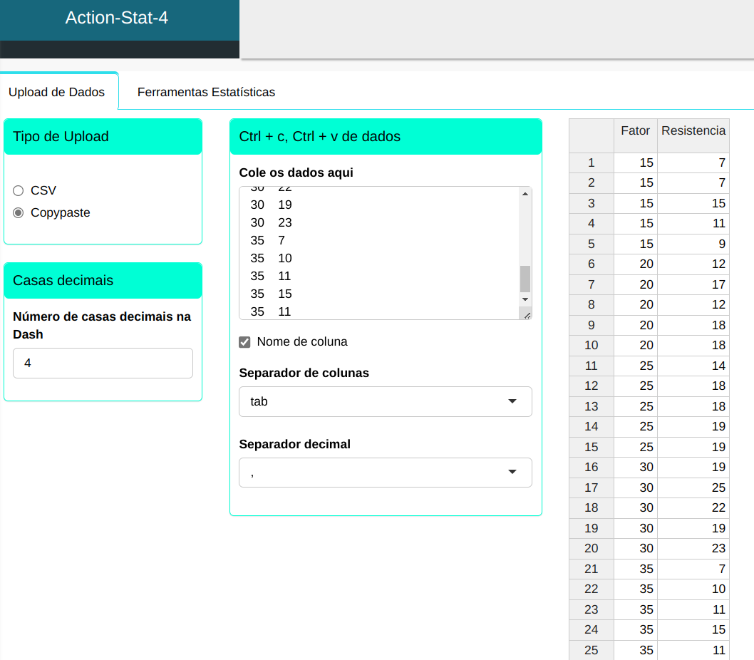 Considere o processo de produção de uma fibra sintética, em que o experimentador quer conhecer a influência da porcentagem de algodão na resistência da fibra. Para isto, foi realizado um experimento totalmente aleatorizado, em que diversos níveis de porcentagem de algodão foram avaliados com respeito à resistência da fibra. Um ponto importante no planejamento do experimento é que para cada nível do fator (porcentagem de algodão), os outros fatores que influenciam o processo (como o meio ambiente, máquina, matéria-prima, etc.) devem apresentar um padrão homogêneo de variabilidade. No experimento, tomamos 5 níveis para a porcentagem de algodão e 5 replicações.