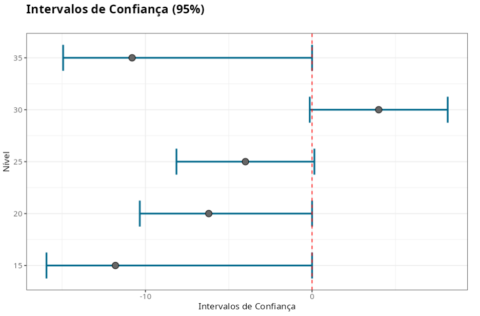 No teste de HSU queremos que a maior parte do intervalo seja positiva, assim o nível 30 é o melhor, quando consideramos o teste "maior média é a melhor".