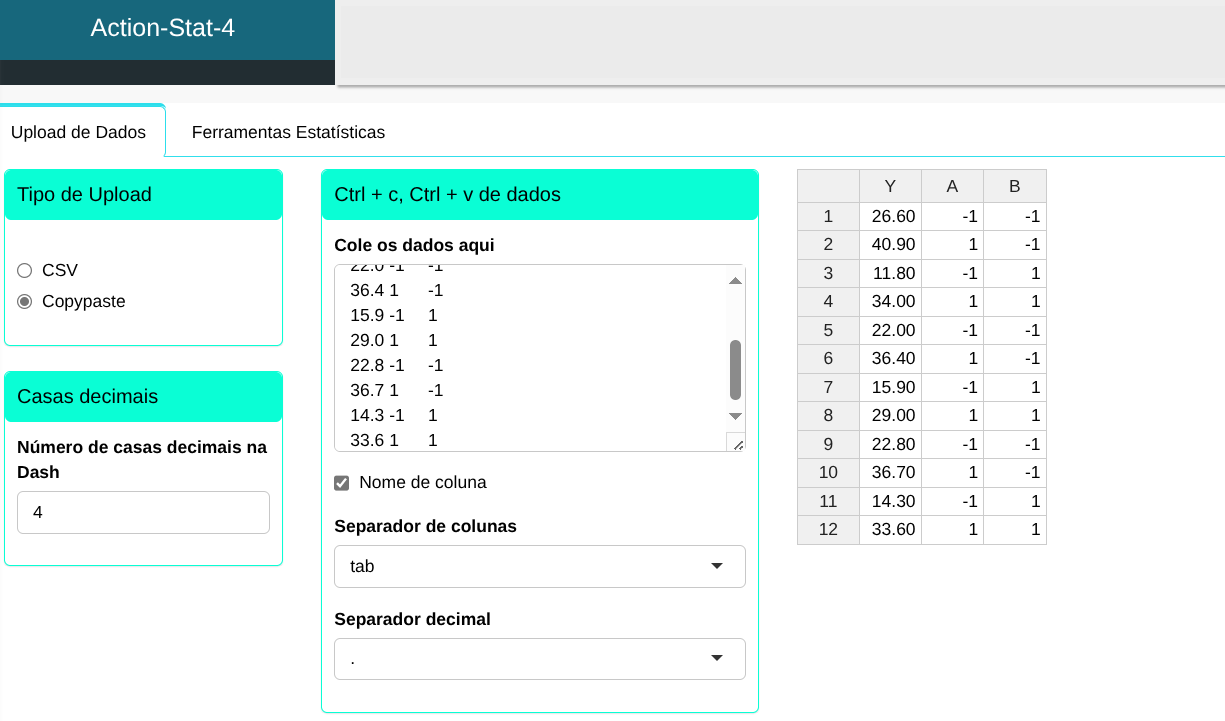 Primeiro, carregamos os dados, você pode inserir os dados no formato .csv ou copiando e colando os valores no campo.