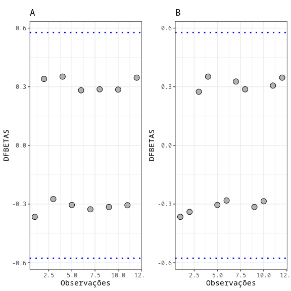 | N.Obs | A | B | Resíduos | Resíduos Studentizados | Resíduos Padronizados | Leverage | DFFITS | DFBETA | D-COOK |