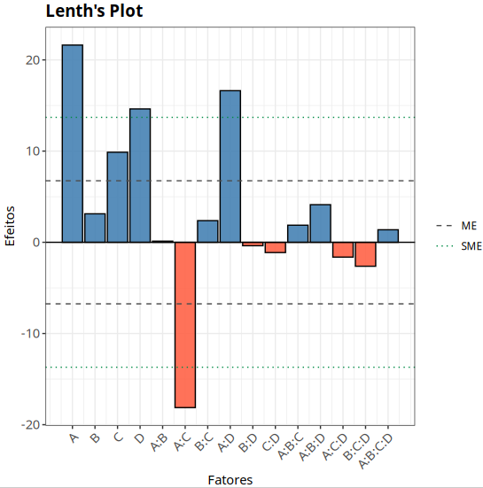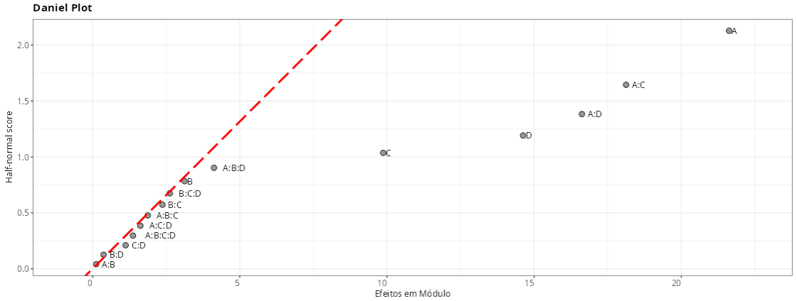 A partir dos resultados e gráficos obtidos. temos que para os fatores A. D e interações A:C e A:D são significativos.