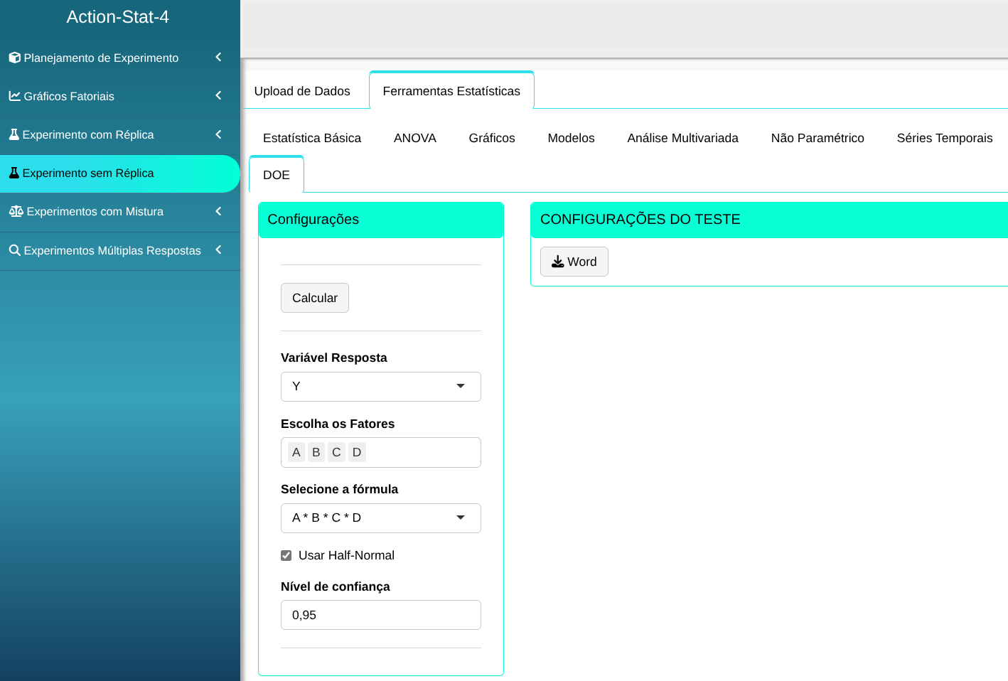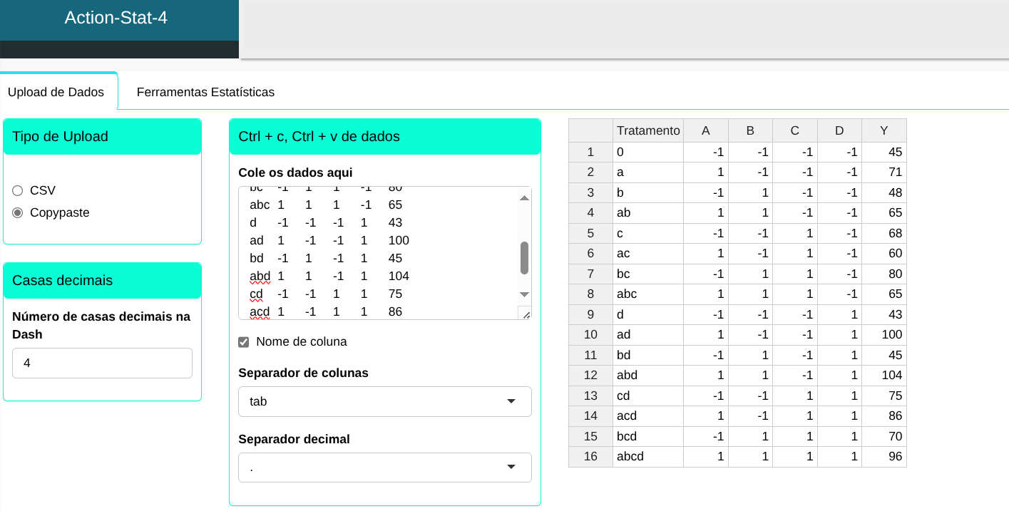 Um determinado produto químico é produzido em um recipiente de pressão. Com o objetivo de estudar quais fatores influenciam a taxa de filtração de produto (Y), foi realizado um experimento fatorial no qual foram considerados 4 fatores: A (temperatura), B (pressão), C (concentração de formaldeído) e D (velocidade de agitação), Cada fator é observado em dois níveis.
