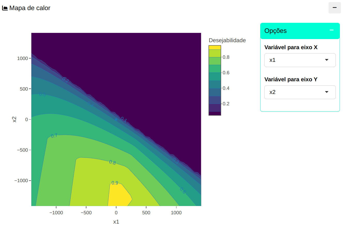 Em na janela da “Desejabilidade” Mostra-se qual é a melhor solução junto com o mapa de calor.