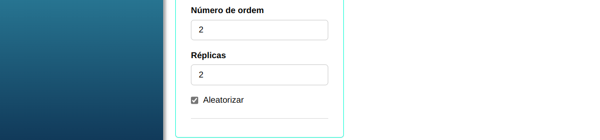 | Ordem | Bloco | A | B | C | D | A:B | A:C | B:C | A:D | B:D | C:D | A:B:C | A:B:D | A:C:D | B:C:D | |