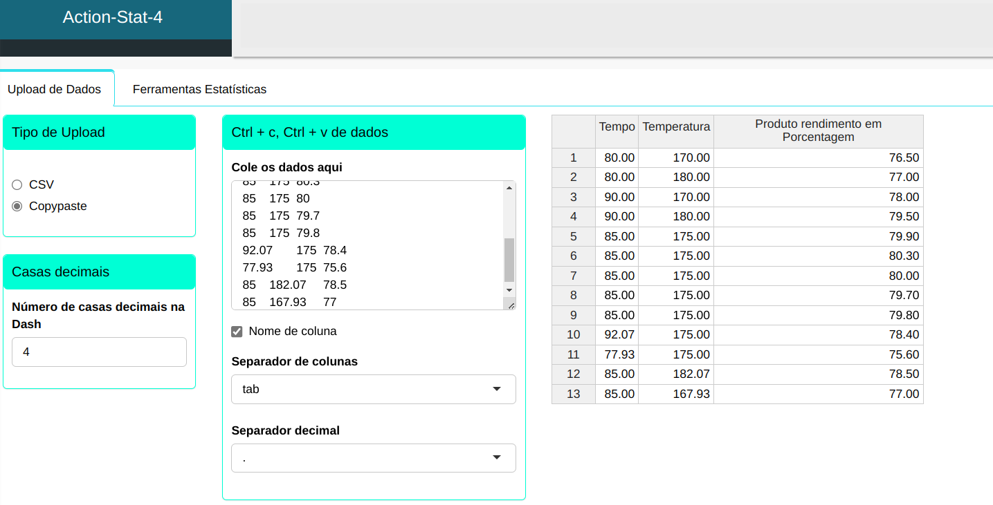 (Montgomery, 1985) Na análise de um processo químico vamos desenvolver um modelo de superfície de resposta de ordem 2 para relacionar o tempo de reação e a temperatura em relação ao rendimento do produto. Na tabela 6.1.1.1, temos os dados originais antes do planejamento de composição central.
