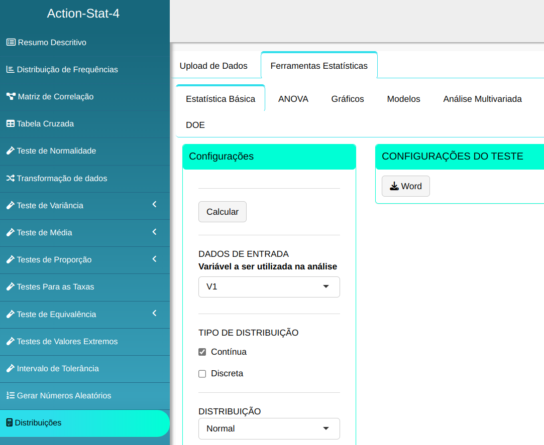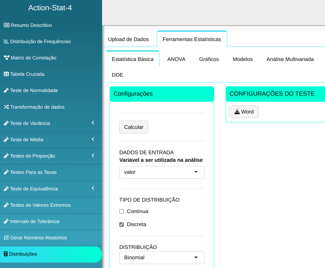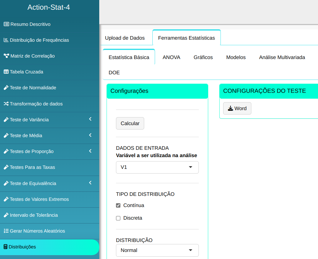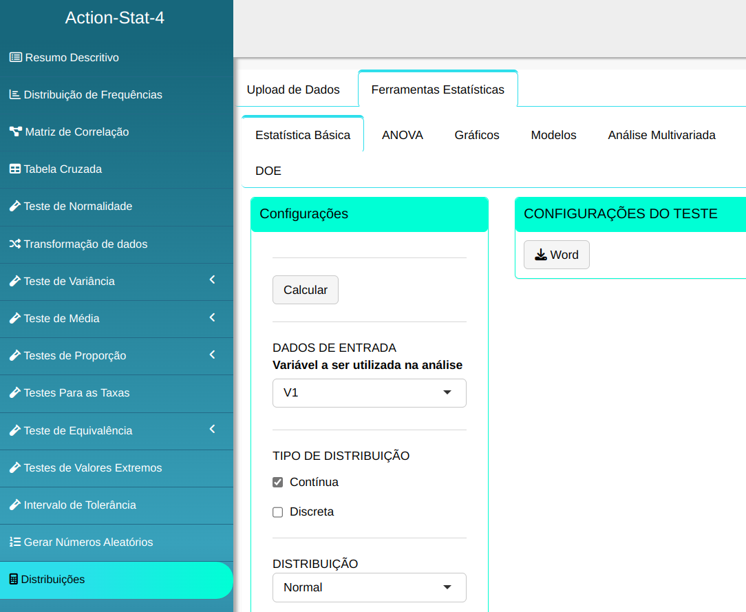 A ferramenta Distribuições do Action calcula a densidade, quantil e o percentil de diversas distribuições contínuas e discretas.