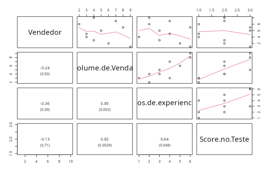 Vemos, inicialmente, que a correlação positiva (0,846) entre o volume de vendas e os anos de experiência é significativa (comprovada pelo p-valor de 0,002), menor que o nível de significância adotado de 5%. Da mesma forma ocorre associação significativa entre o volume de vendas e o score no teste de inteligência e, entre os anos de experiência e o score.