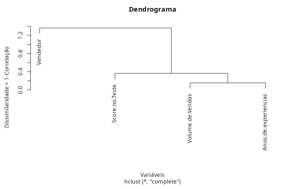 Complementando a tabela acima, através da matriz vemos que às três variáveis em estudo possuem associação linear entre si, sendo esta ainda, positiva. Assim, exemplificando, conforme os anos de experiência do vendedor aumentam, seu volume de vendas também tende a ser maior. Com relação às demais associações, a interpretação será análoga.