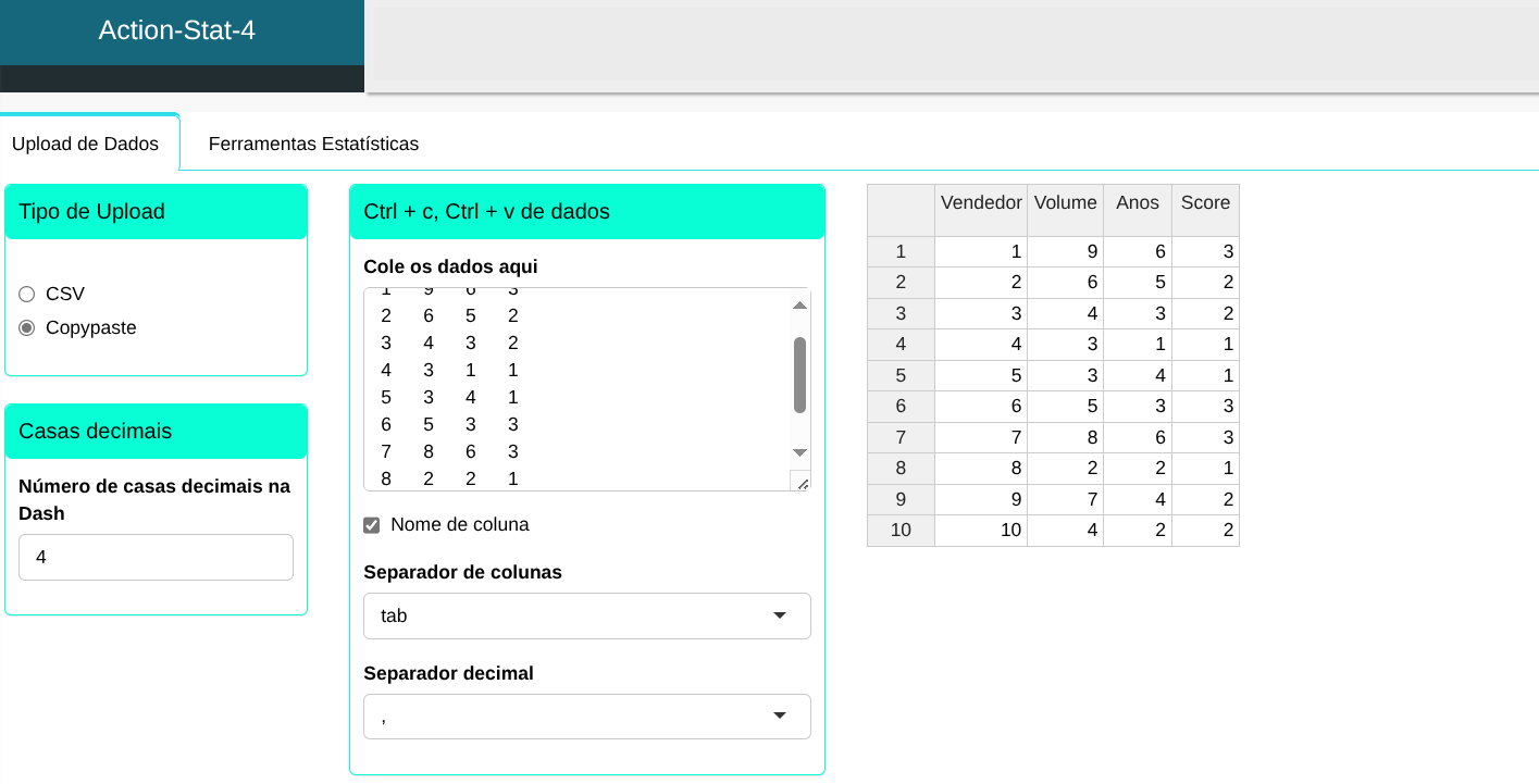 Uma empresa pretende estudar a relação entre o volume de vendas efetuadas durante um dado período de tempo por seus vendedores, considerando seus anos de experiência e seu score num teste de inteligência. Faremos o Upload dos dados no sistema.