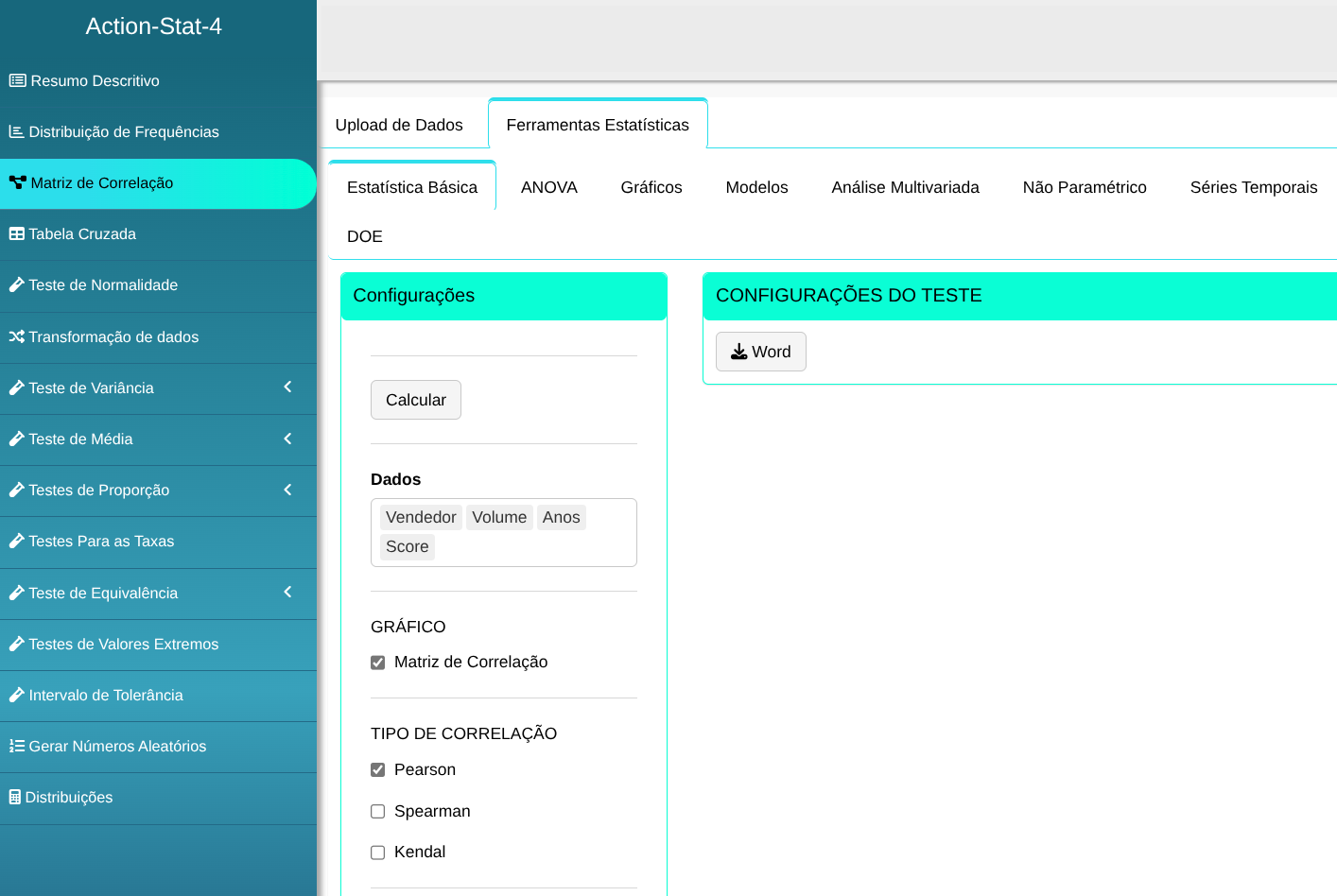 A ferramenta Matriz de Correlação permite calcular a correlação entre variáveis através dos coeficientes de Pearson, Spearman ou Kendall. A opção de gráfico permite gerar uma Matriz de Scatterplots.