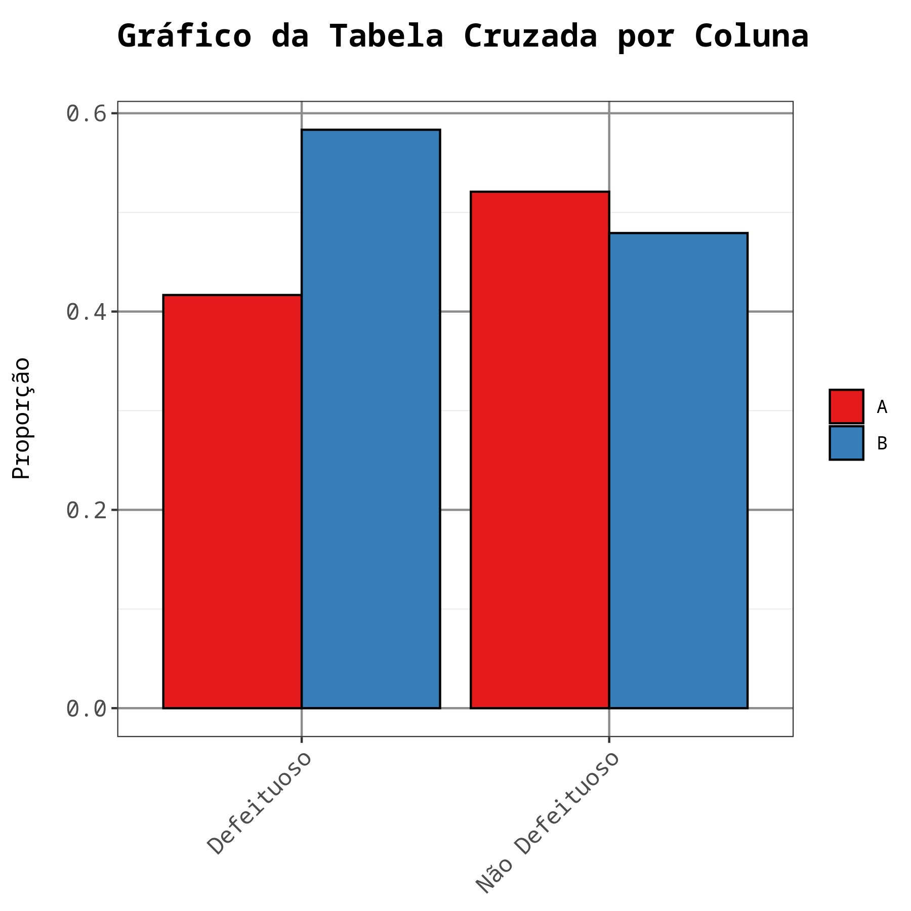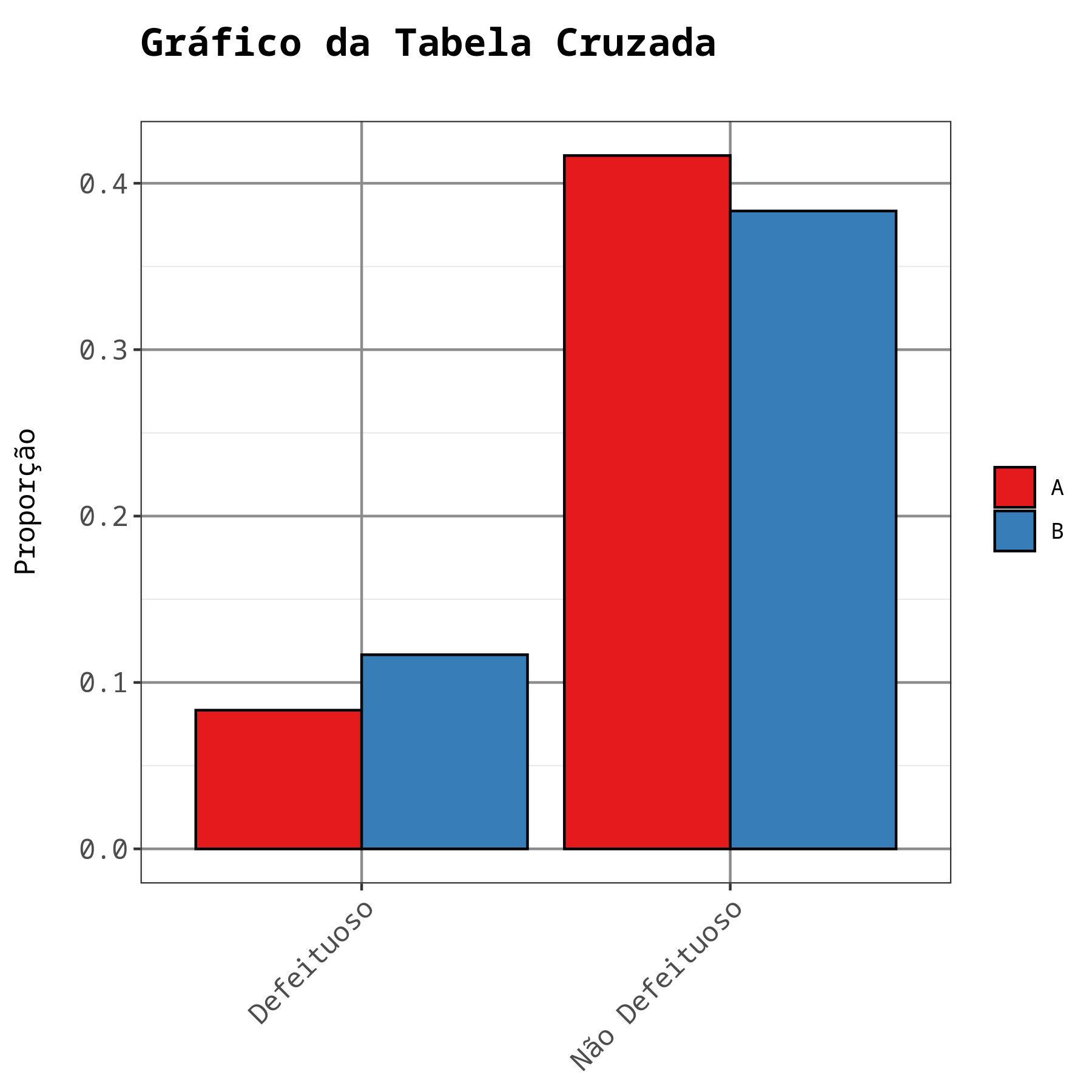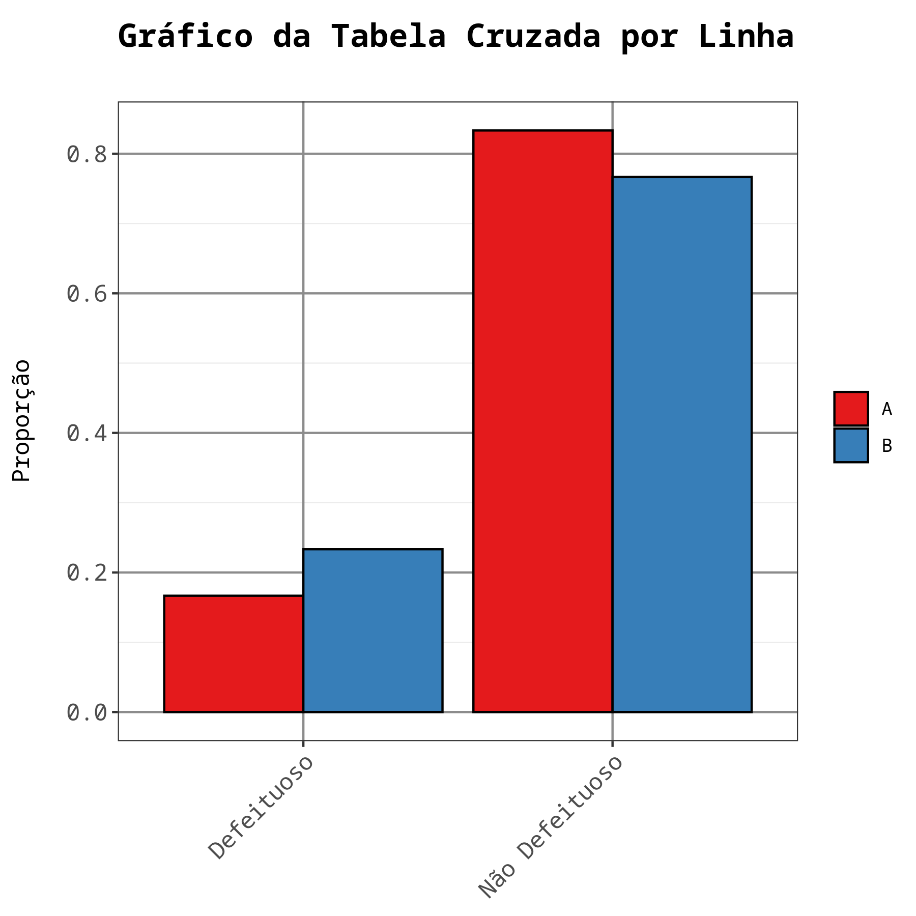 As tabelas liberadas apresentam as ocorrências absolutas e percentuais dos casos estudados. Vemos nelas que 58,33% do total de itens defeituosos (12 no geral) estão no primeiro lote (B), estando o restante, no lote A, 41,67%. Tal diferença não parece ser significativa, visto que ambas porcentagens estão relativamente próximas.