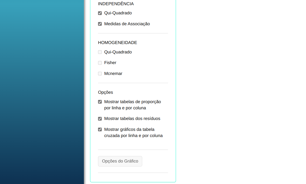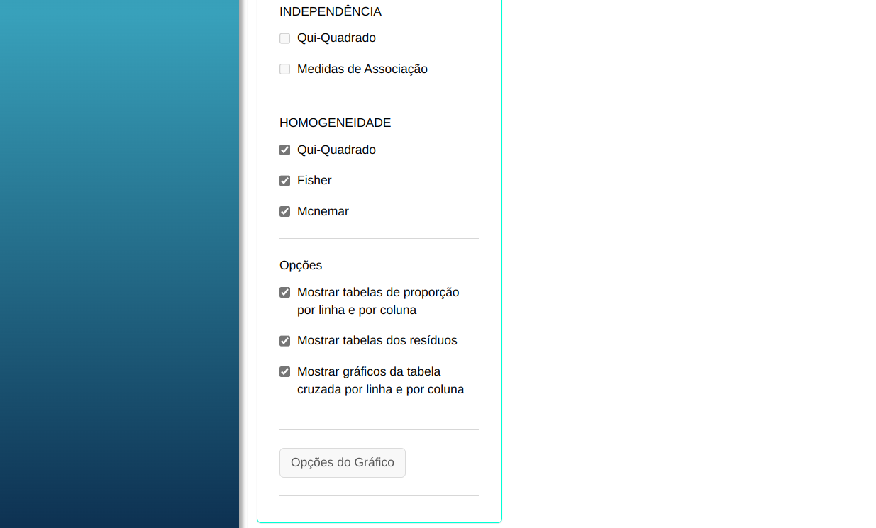A ferramenta Tabela Cruzada possui opções de teste de independência, (qui-quadrado, medidas de associação) e teste de homogeneidade (qui-quadrado Fisher Mcnemar).