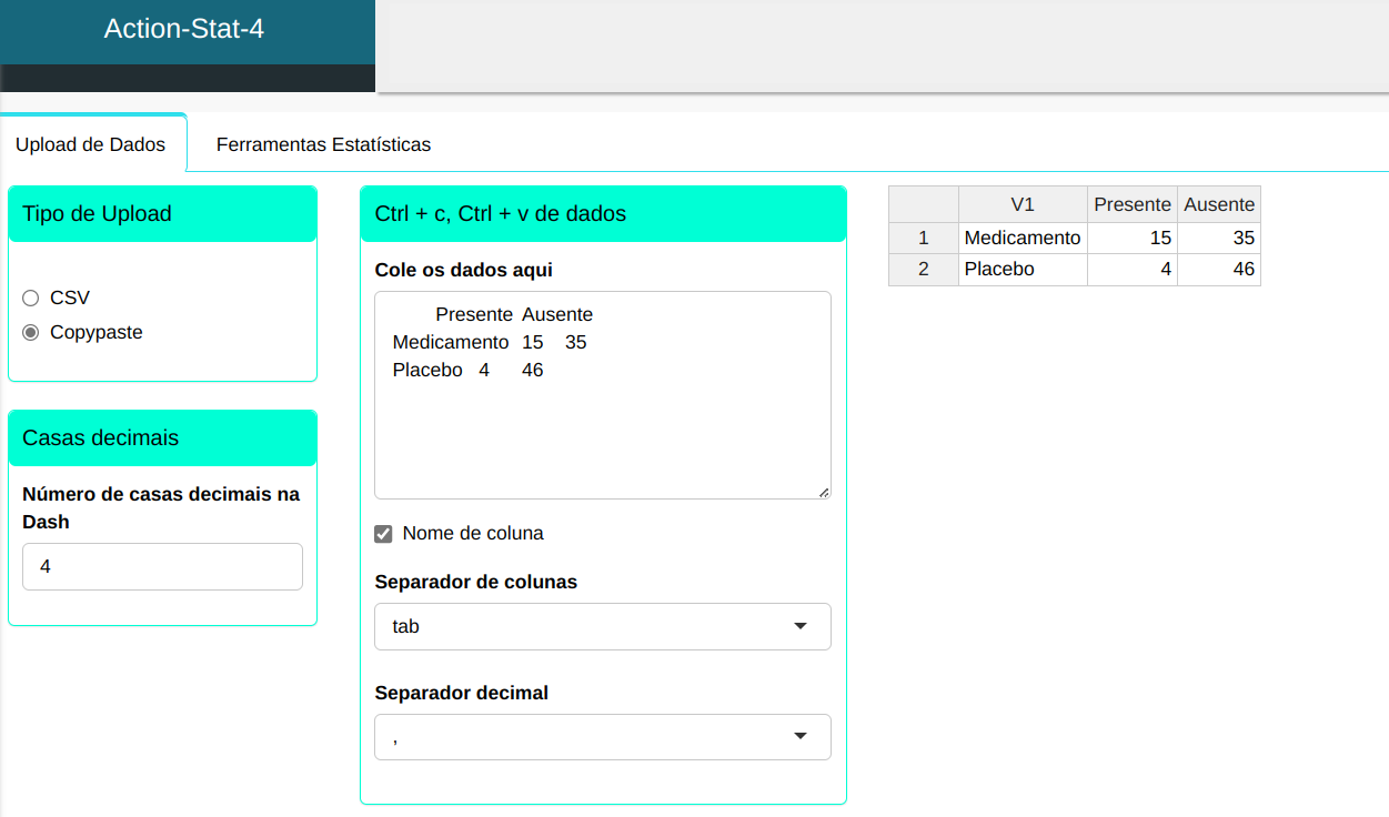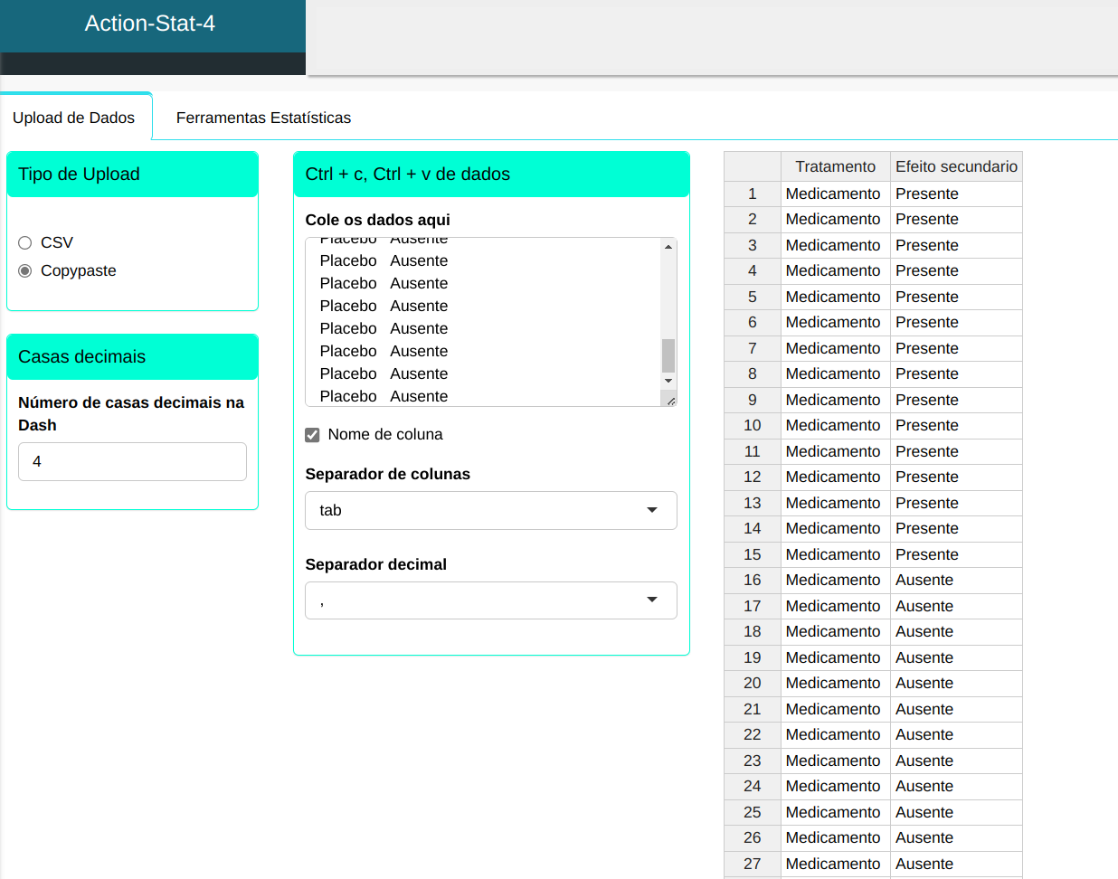 Analisar os dados de forma resumida num estudo sobre os efeitos secundários causados por um medicamento. Para realizar este estudo, utilizámos o medicamento em 50 doentes e tratámos outros 50 doentes como grupo de controlo, administrando um placebo.