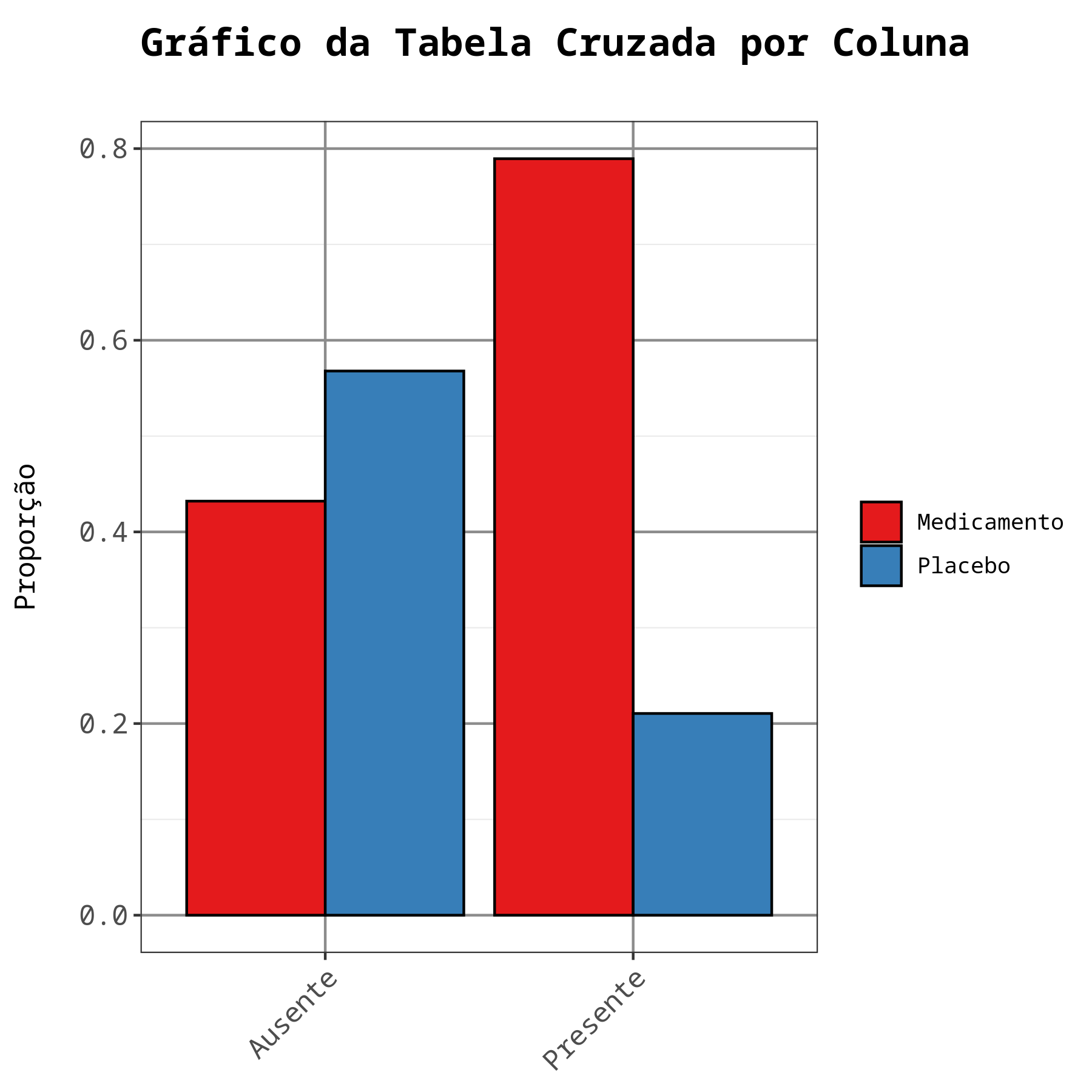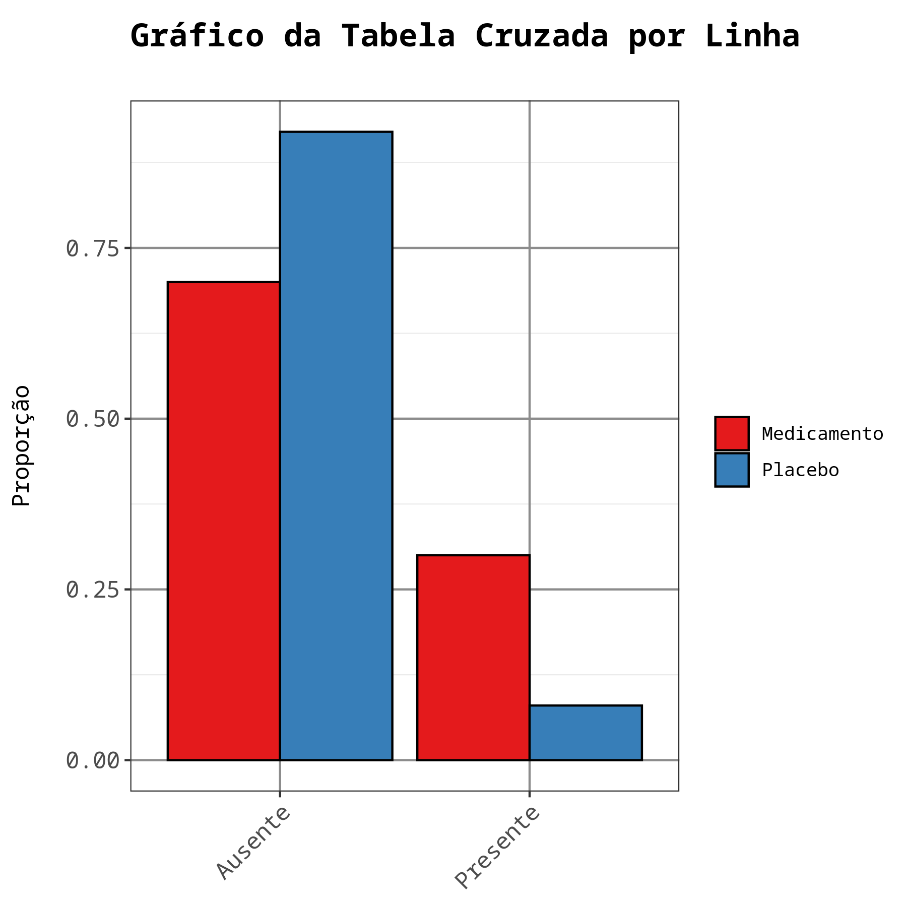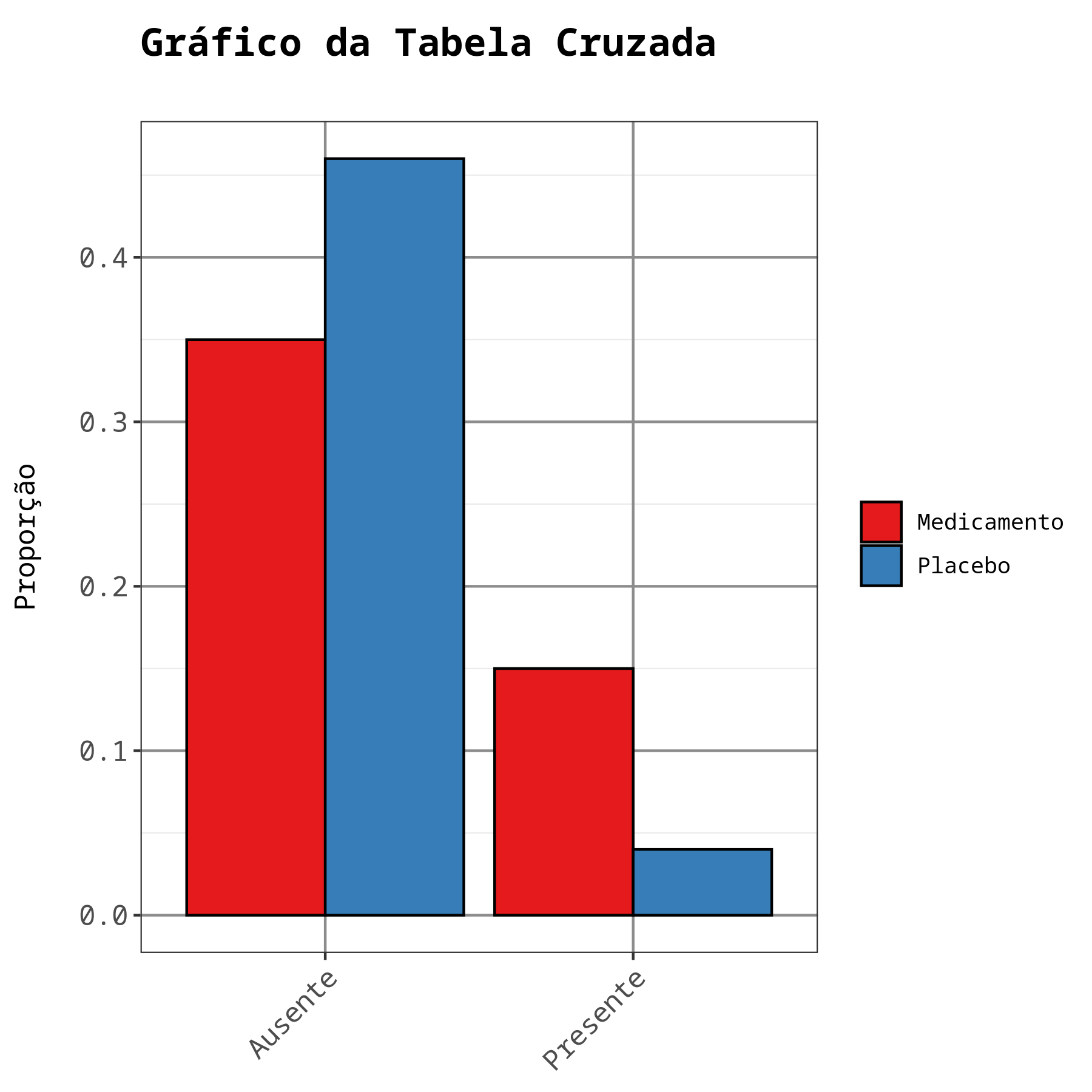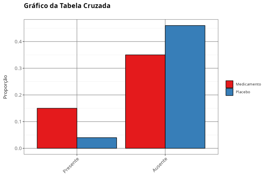 Observamos os dados colhidos num estudo sobre os efeitos secundários, provocados por um medicamento. Para levar este estudo a efeito, utilizamos o medicamento em 50 doentes, e servimos de outros 50 doentes como grupo testemunha, administrando um placebo.