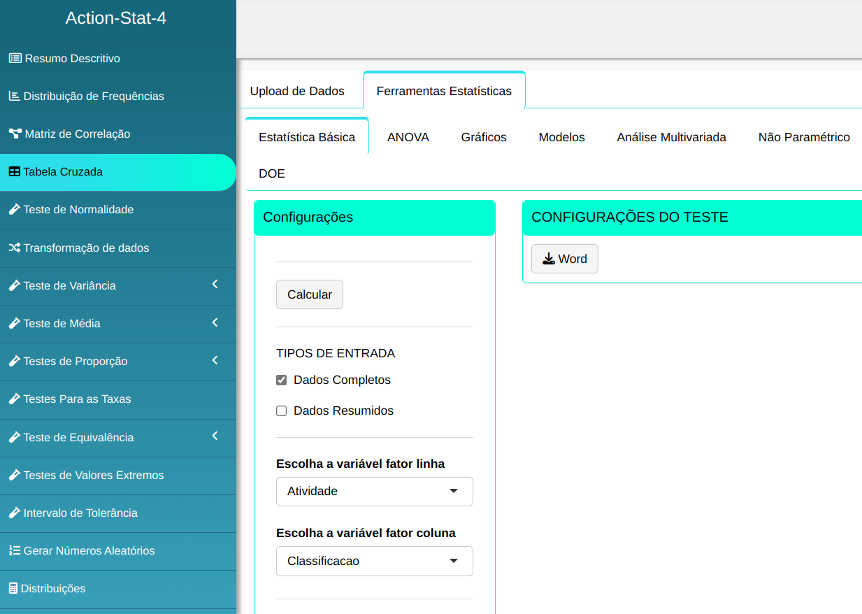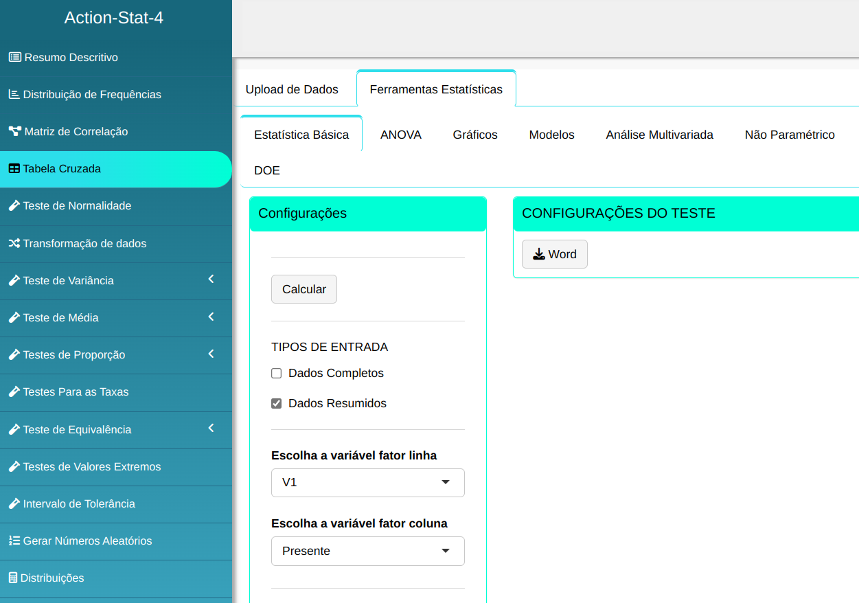 A ferramenta Tabela Cruzada possui opções de teste de independência, (qui-quadrado, medidas de associação) e teste de homogeneidade (qui-quadrado Fisher Mcnemar).