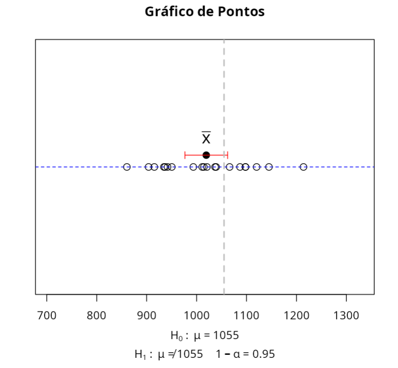 Um Engenheiro de produção quer testar, a um nível de significância $\alpha$ = 0,05, se a altura média de uma haste está próxima do valor nominal 1055 mm, a partir de uma amostra de tamanho 20 com média 1019,369 e desvio-padrão 91,36863.