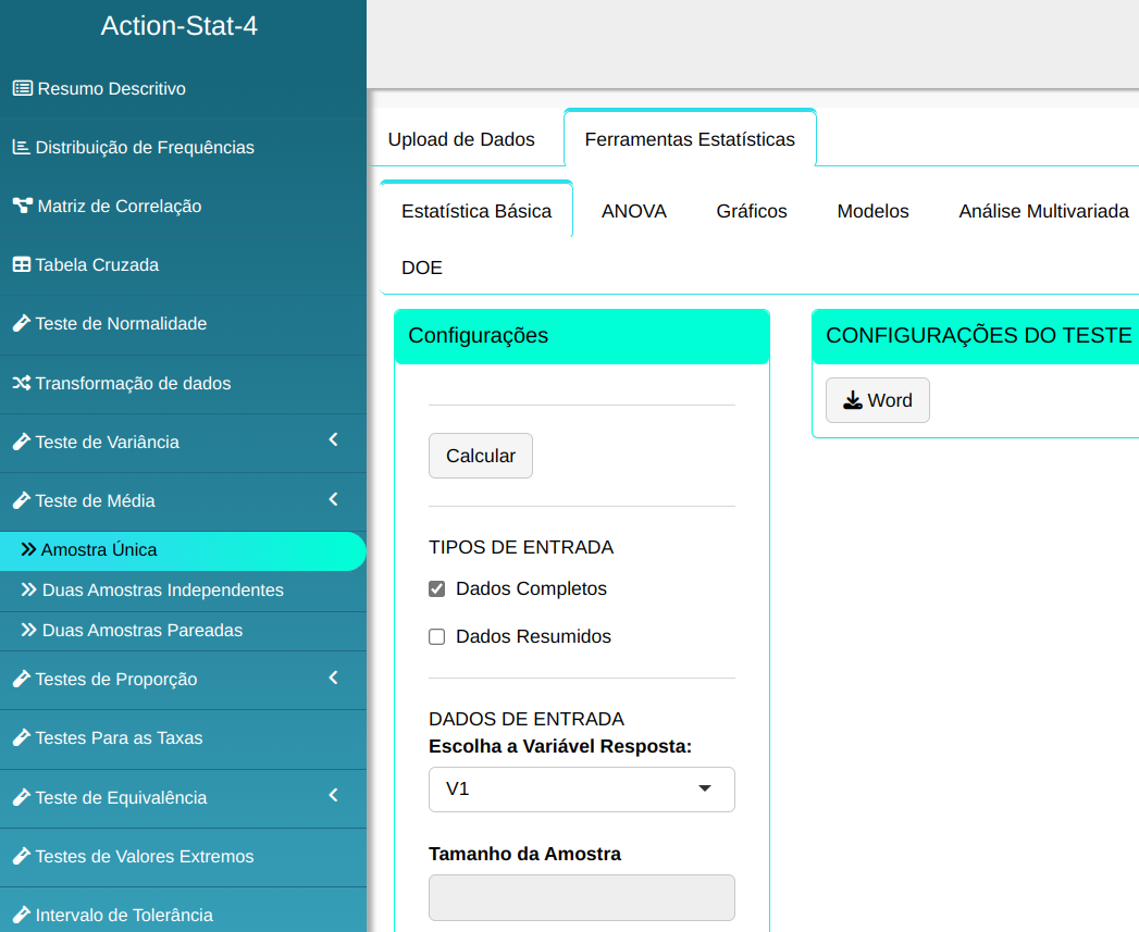 Para realizar um teste de média, o procedimento é executado conforme a configuração apresentada na figura abaixo.