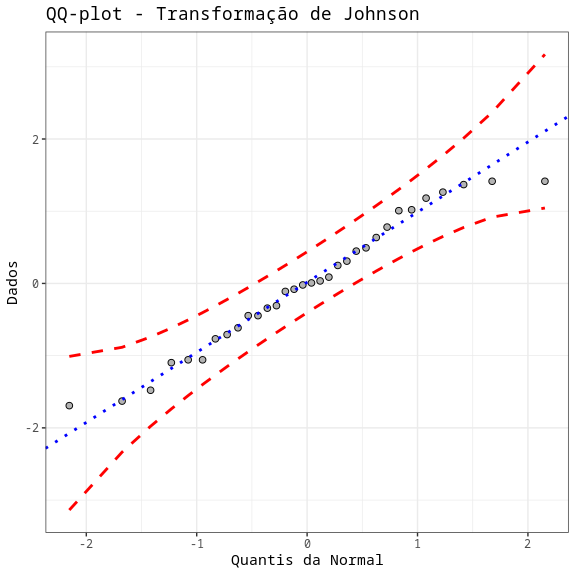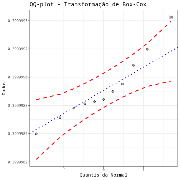 Pelo Gráfico QQ-plot verificamos que a suposição de normalidade está satisfeita, além disso, obtemos um p-valor de 0,309 no teste de Anderson-Darling o qual indica que os dados seguem uma distribuição normal. Observamos que a observação número 11 encontra-se fora do envelope do QQ-plot, porém, isso não descaracteriza a suposição de normalidade dos dados transformados.