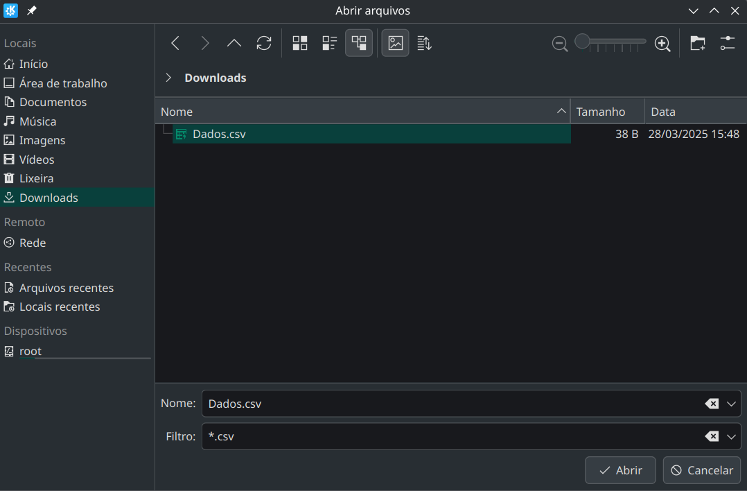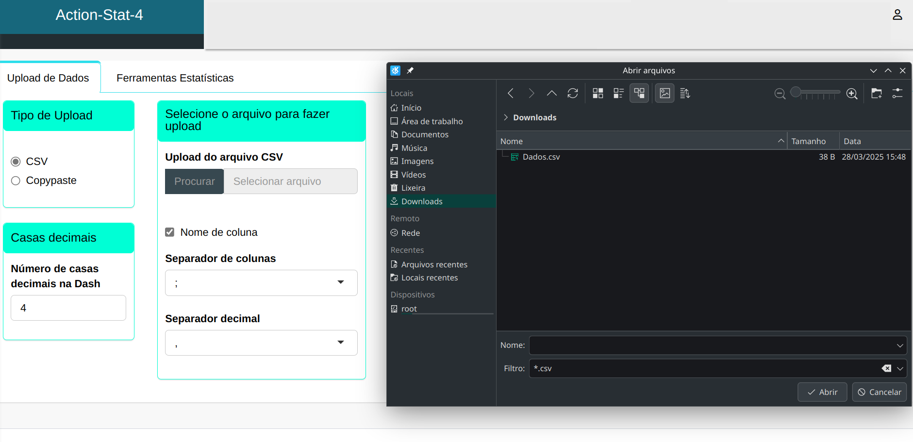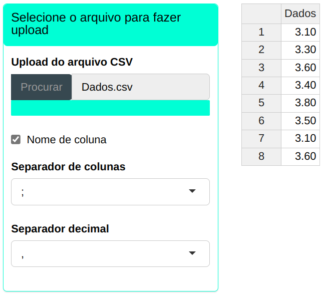 É importante destacar que o caractere selecionado como separador de colunas deve corresponder ao utilizado no conjunto de dados (no exemplo, a barra), e o mesmo principio se aplica para o caractere selecionado como separador decimal - caso seja selecionado um diferente, o sistema não reconhecerá os dados como numéricos, resultando em erro de análise.