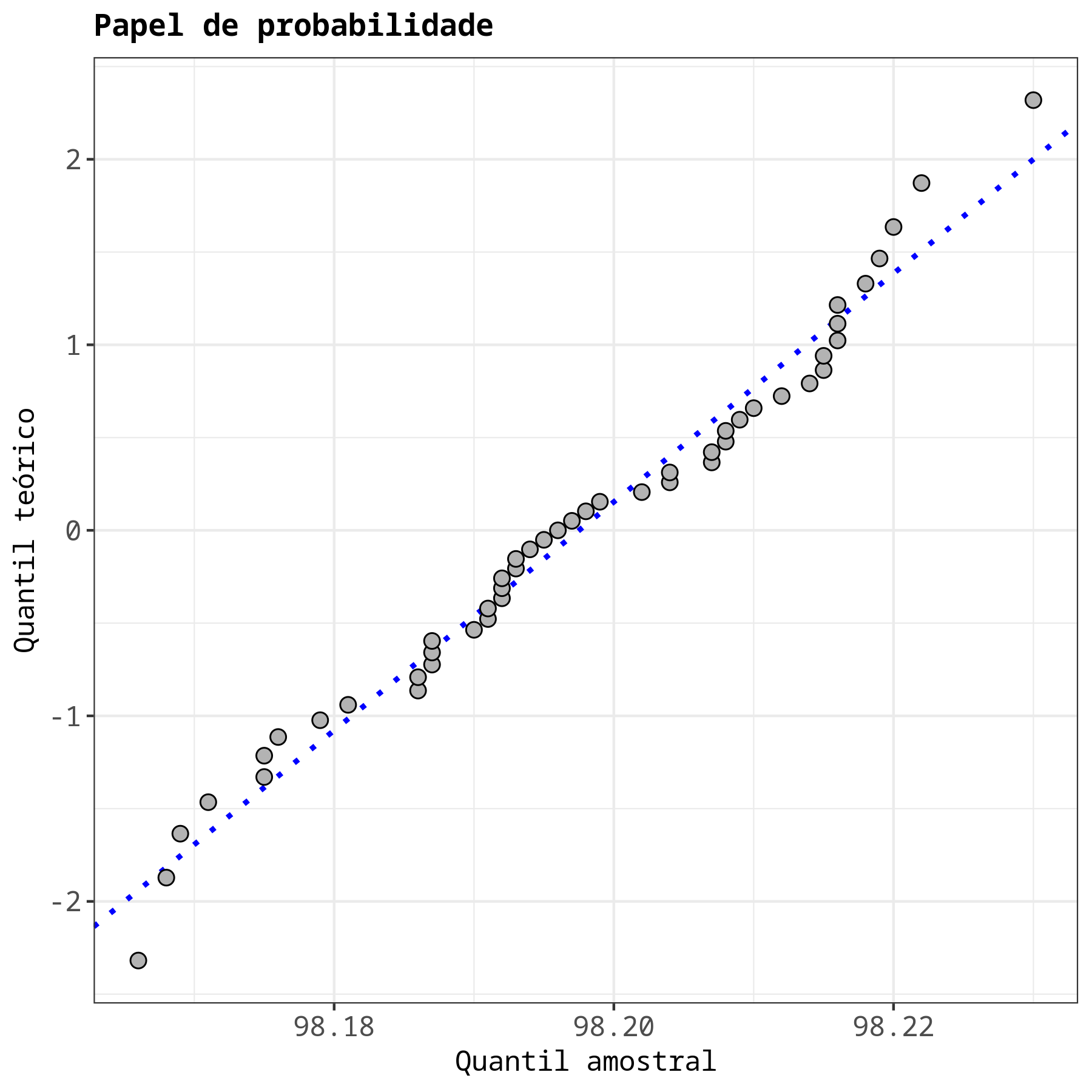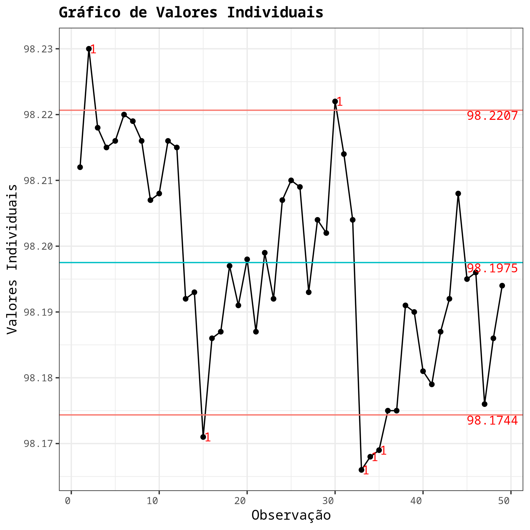 Os dados a seguir se referem ao controle da distância entre dentes de uma engrenagem do câmbio. A cada trinta peças produzidas, a última peça foi levada ao laboratório para ser medida em uma máquina de medição por coordenadas. Para esse exemplo temos LSE = 98,25 e LIE = 98,15.