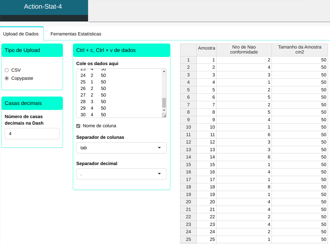 | Amostra | Nro de Não conformidade | Tamanho da Amostra cm2 |