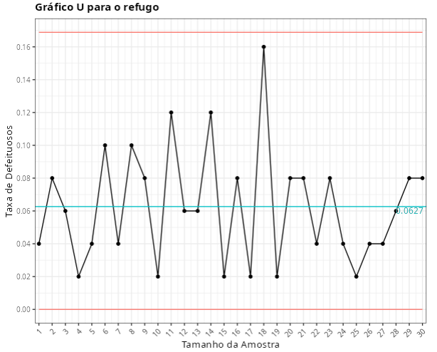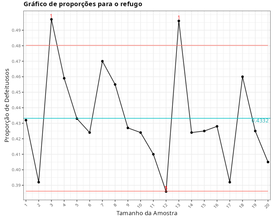 Uma indústria está interessada em analisar a capacidade de um processo em que se verifica a proporção de peças defeituosas em lotes de 1000 peças. Os dados estão dispostos na tabela abaixo.