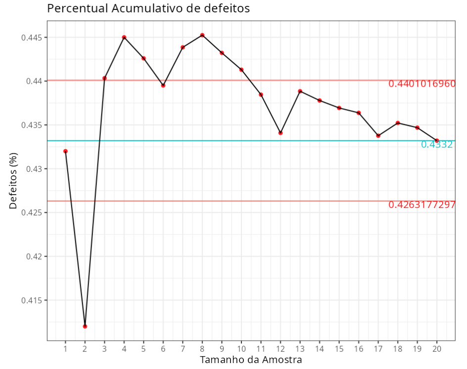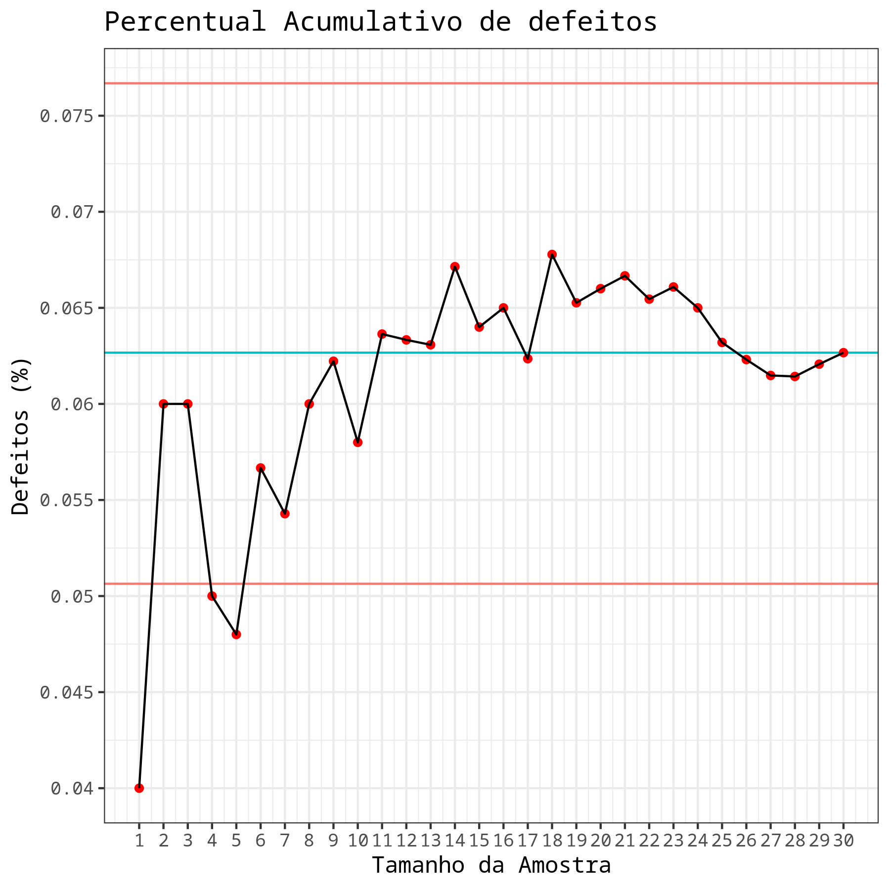 | Defeitos | Tamanho amostral | Percentual de defeito | Defeito acumulado | Total acumulado | Percentual acumulado |