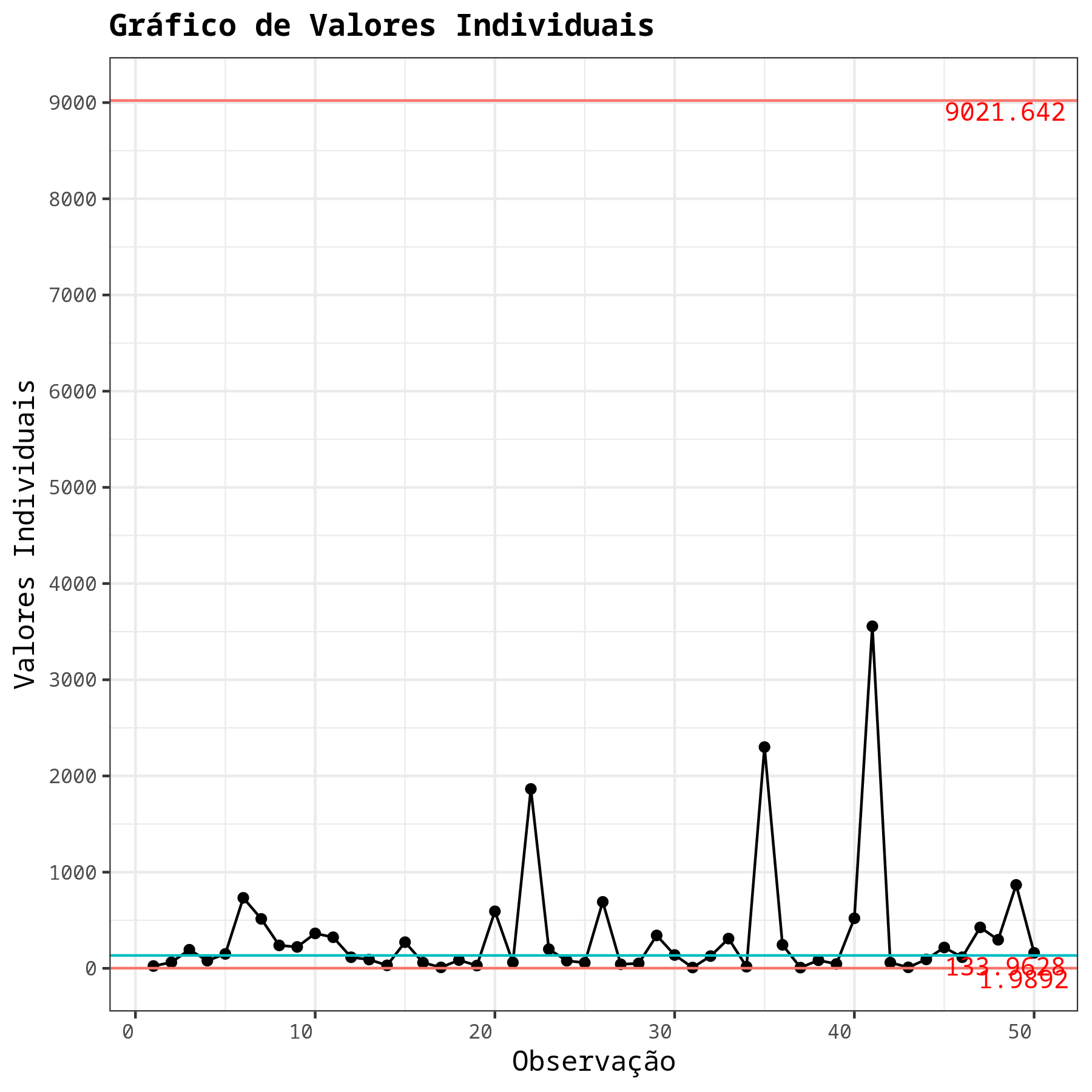 | 41 | 3035.76 | 1 ponto a mais de 3 Sigmas da linha central |