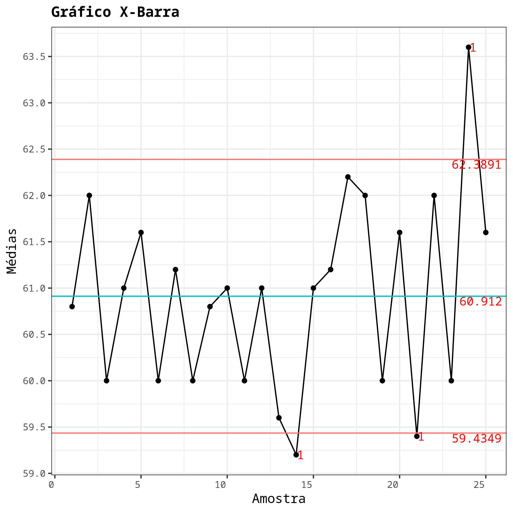 | 23 | 1665.79 | 1 ponto a mais de 3 Sigmas da linha central |