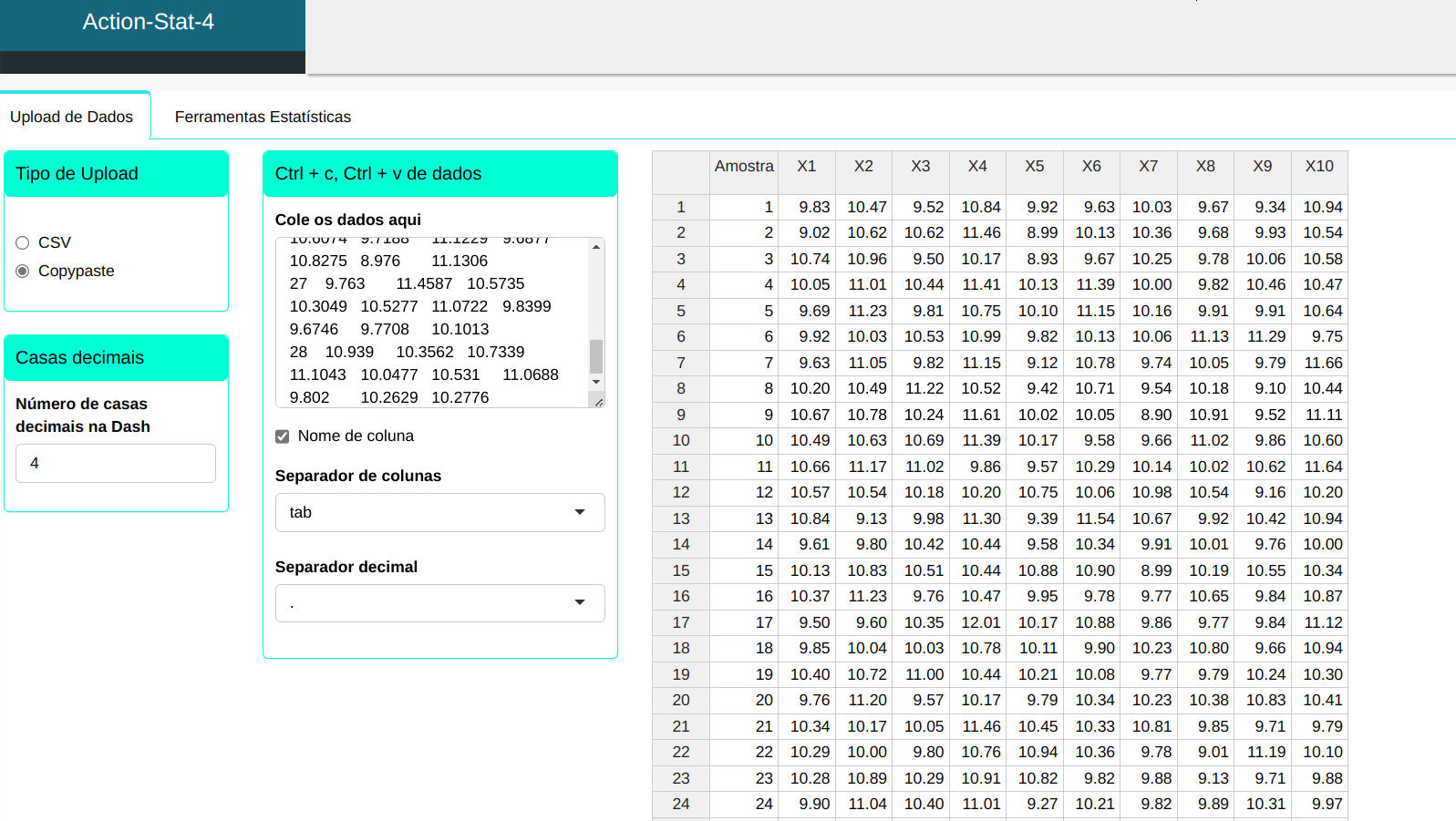 | Amostra | X1 | X2 | X3 | X4 | X5 | X6 | X7 | X8 | X9 | X10 |