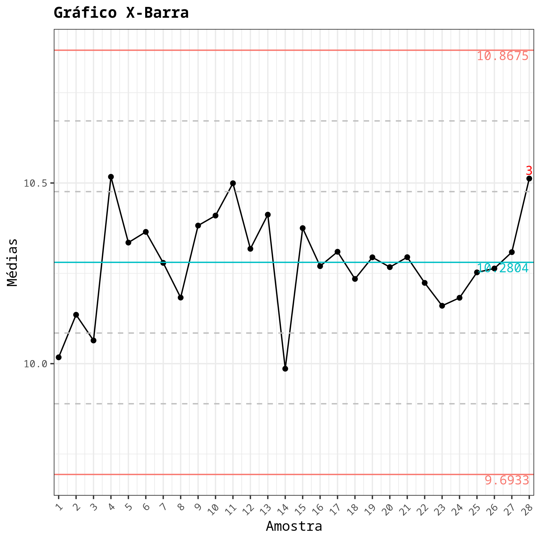 | 26 | 0.728 | 2 de 3 pontos consecutivos maiores que 2 desvios padrão a partir da linha central |