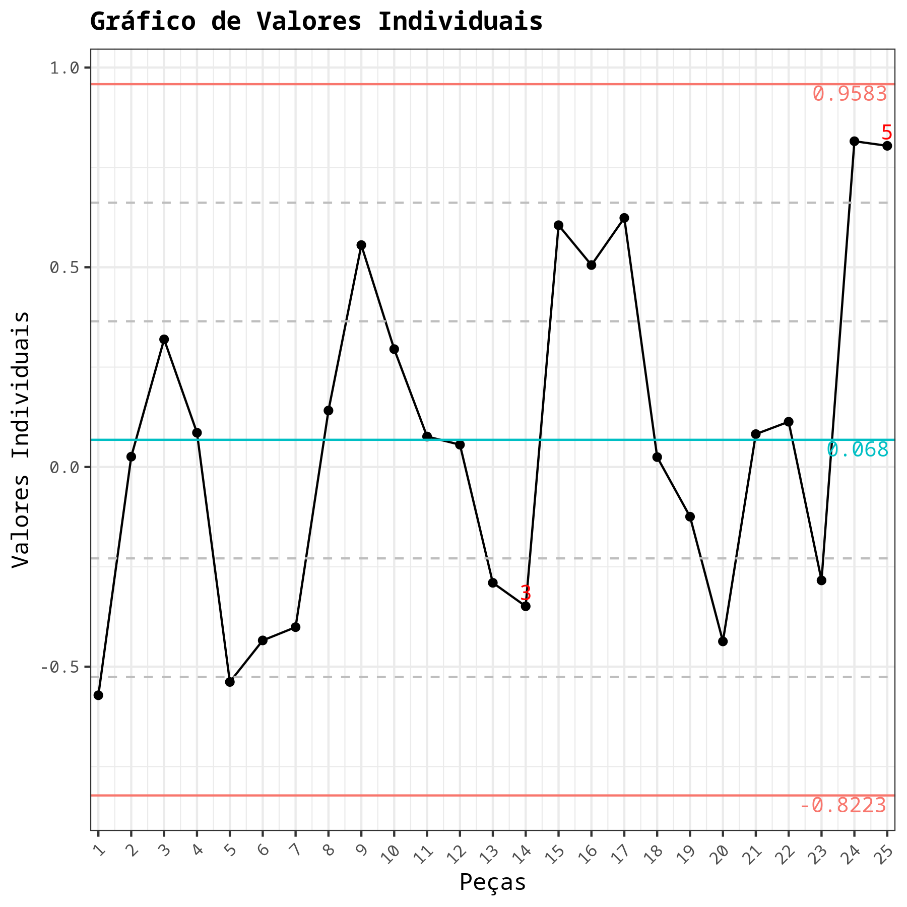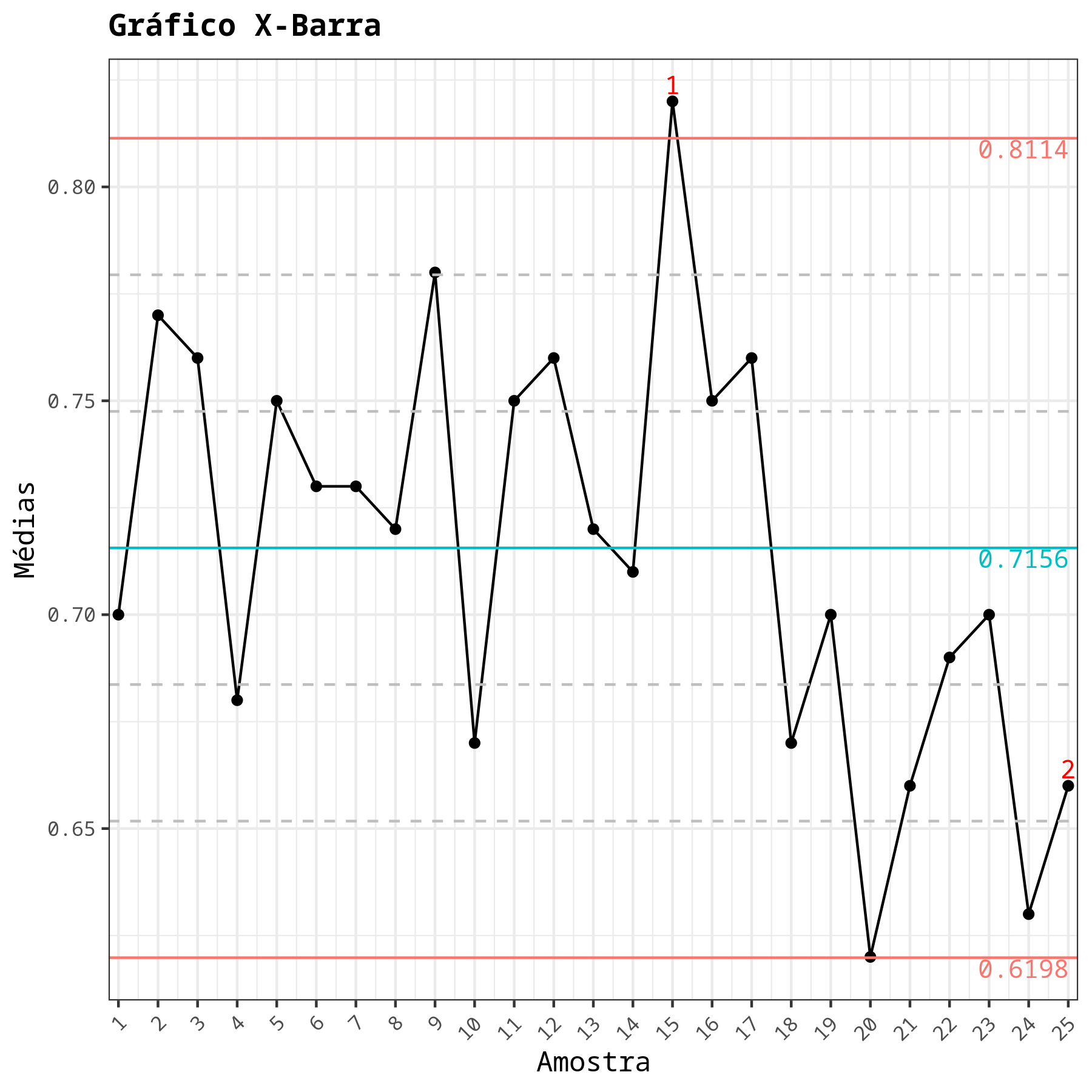 | 25 | 0.58 | 1 ponto a mais de 3 Sigmas da linha central |