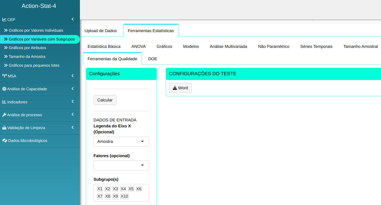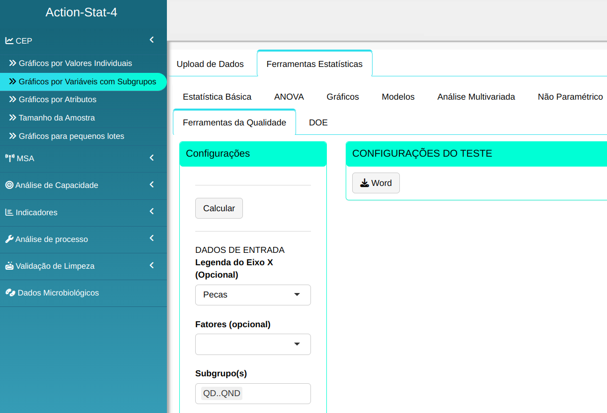 A ferramenta Gráficos por Variáveis com Subgrupos do Action, permite gerar gráficos de Média e Amplitude ( $ \overline X $ e R). Média e Desvio Padrão ($\overline X$ e S) e Gráficos de Valores Individuais com Variação Entre e Dentro dos Grupos (I-MR-R ou I-MR-S).
