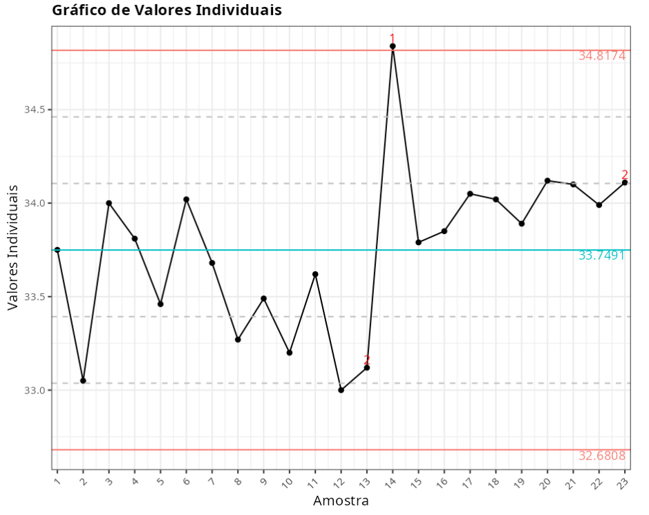 | 14 | 34.84 | Antes | 1 ponto a mais de 3 Sigmas da linha central |