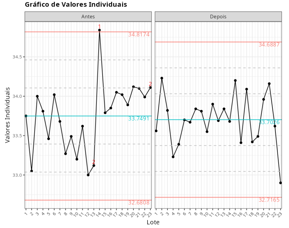 | 14 | 1.72 | Antes | 1 ponto a mais de 3 Sigmas da linha central |