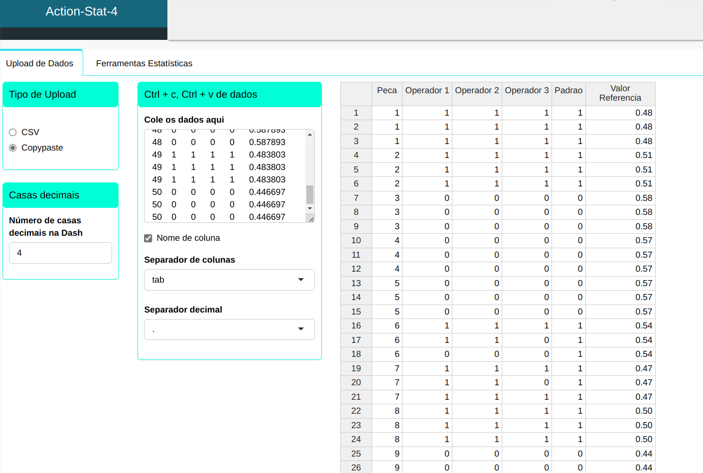 avaliadores com três medições por peça (cada avaliador). Os dados estão