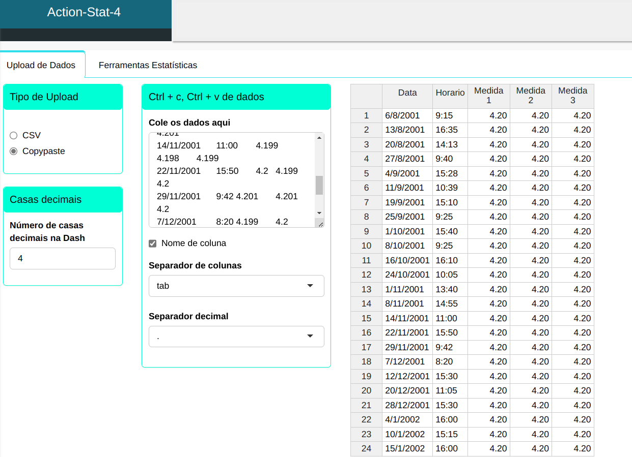 | Data | Horário | Medida 1 | Medida 2 | Medida 3 |