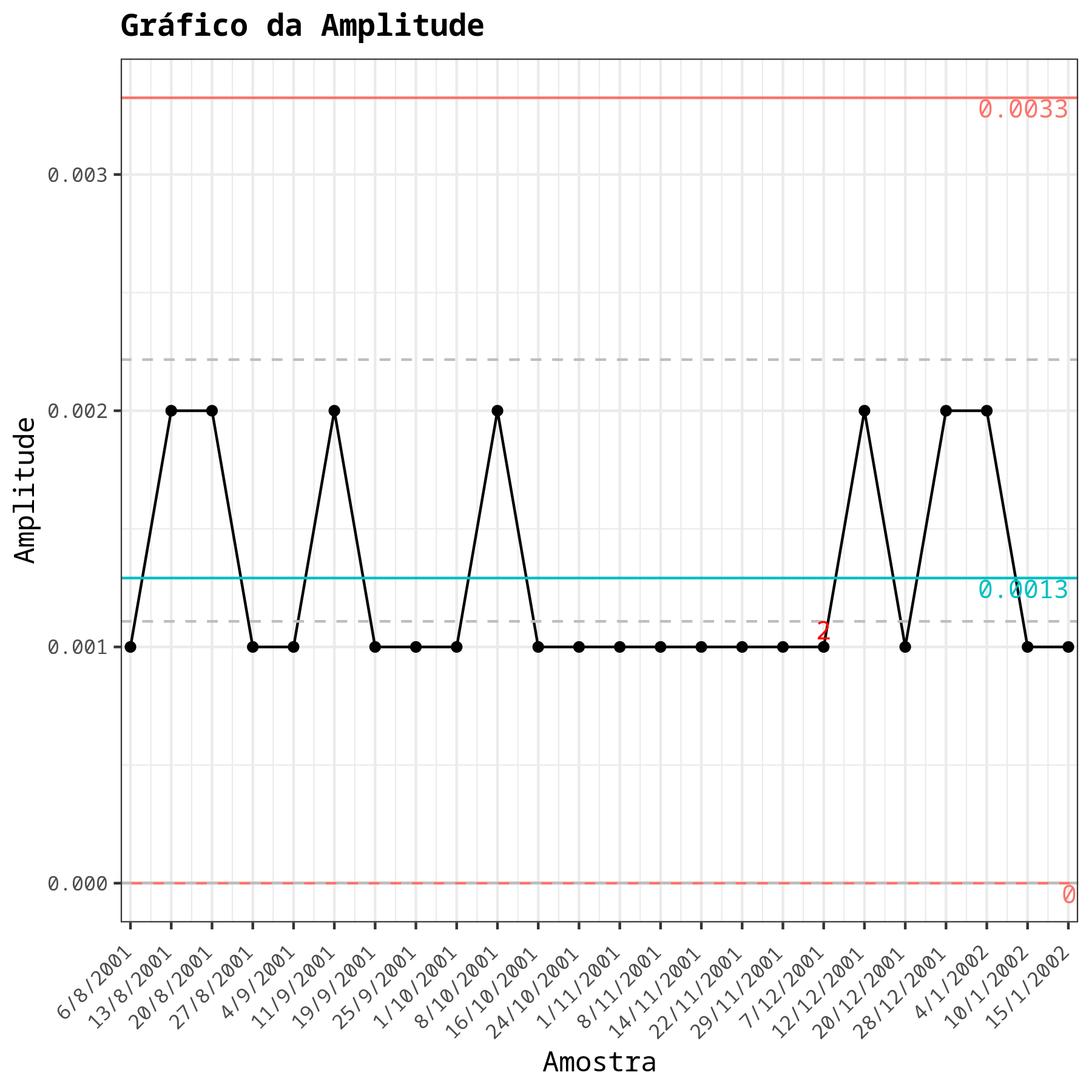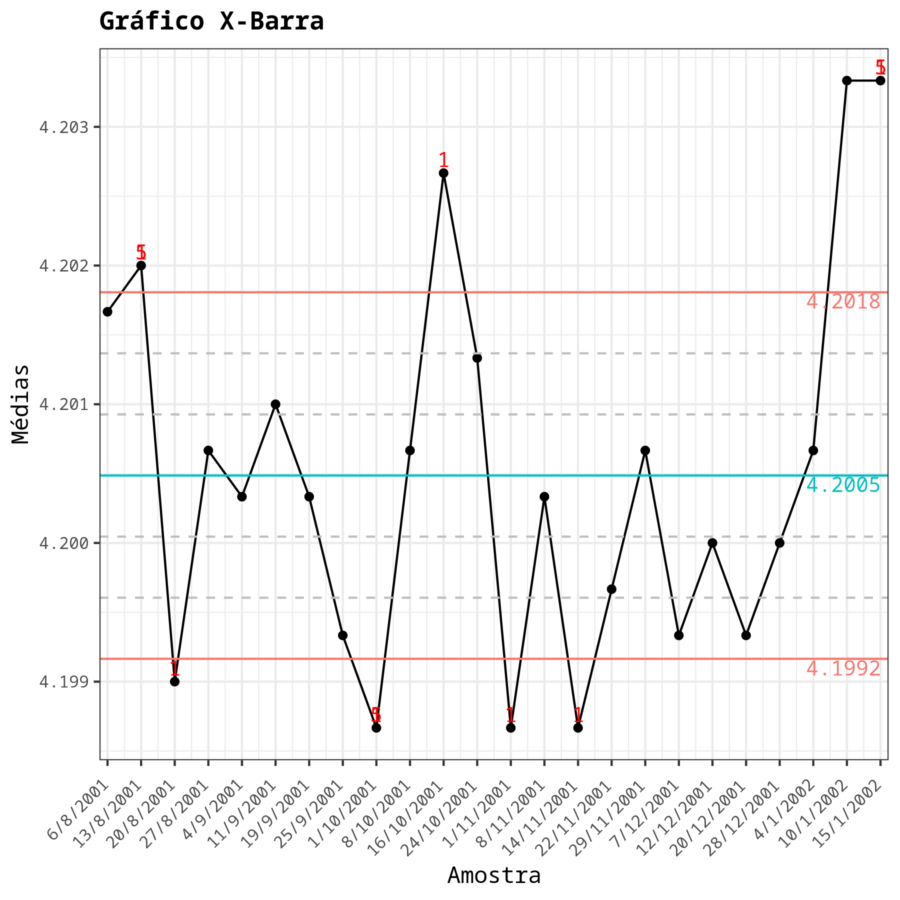 | 13/8/2001 | 4.202 | 2 de 3 pontos consecutivos maiores que 2 desvios padrão a partir da linha central |