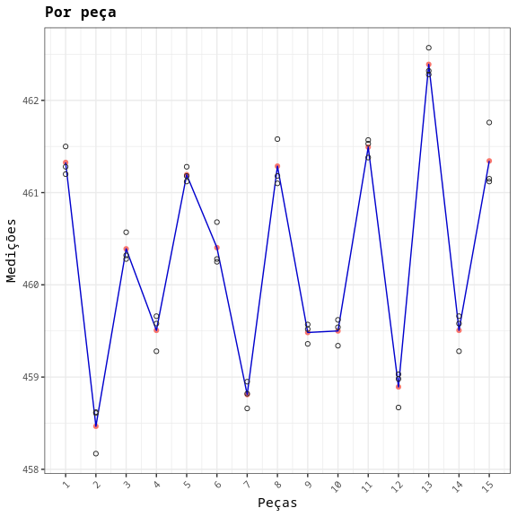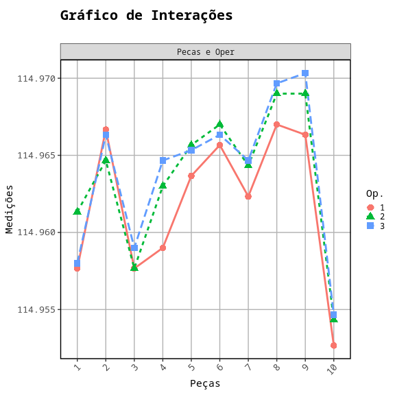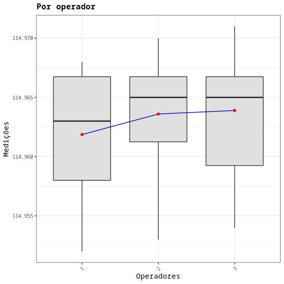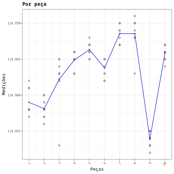 Considere um sistema de medição para medir o diâmetro interno do mancal. O engenheiro da qualidade realizou um experimento com 10 peças, 3 operadores e 3 repetições para cada operador e peça. Os dados obtidos estão apresentados na tabela a seguir.
