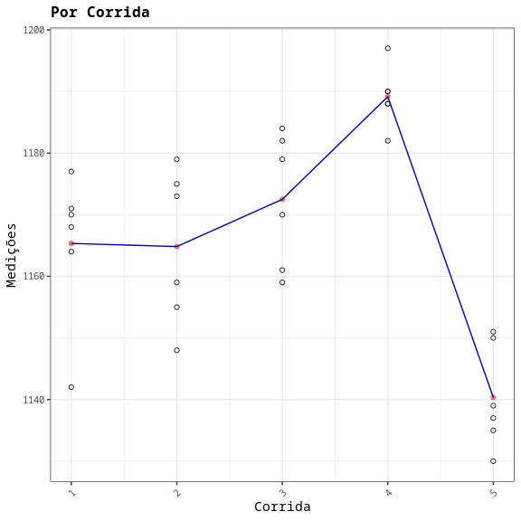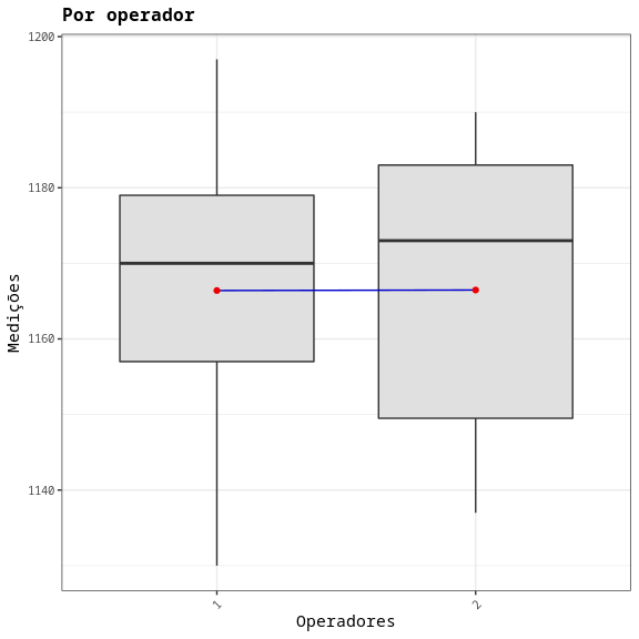 Consideramos a seguir a característica resistência à tração realizada com corpos-de-prova de aço. Foram selecionadas 5 corridas de aço, com pouca variabilidade nas corridas e a variabilidade natural do processo (de produção) entre as corridas. Foram utilizados dois operadores com 3 medições de cada corrida por operador.