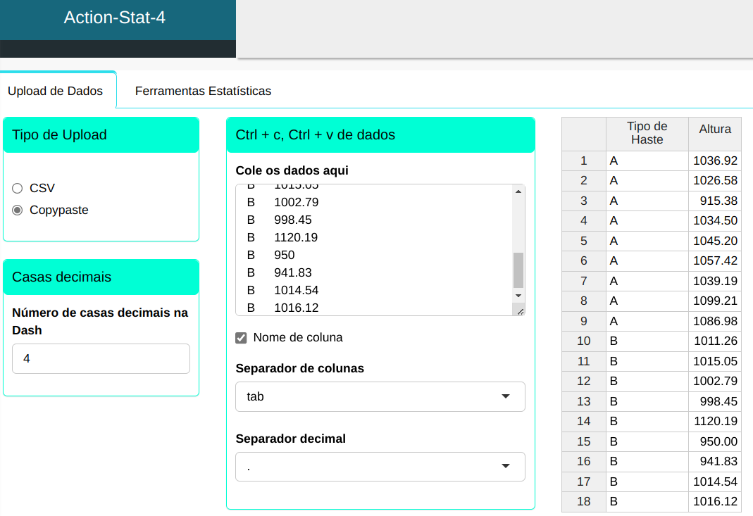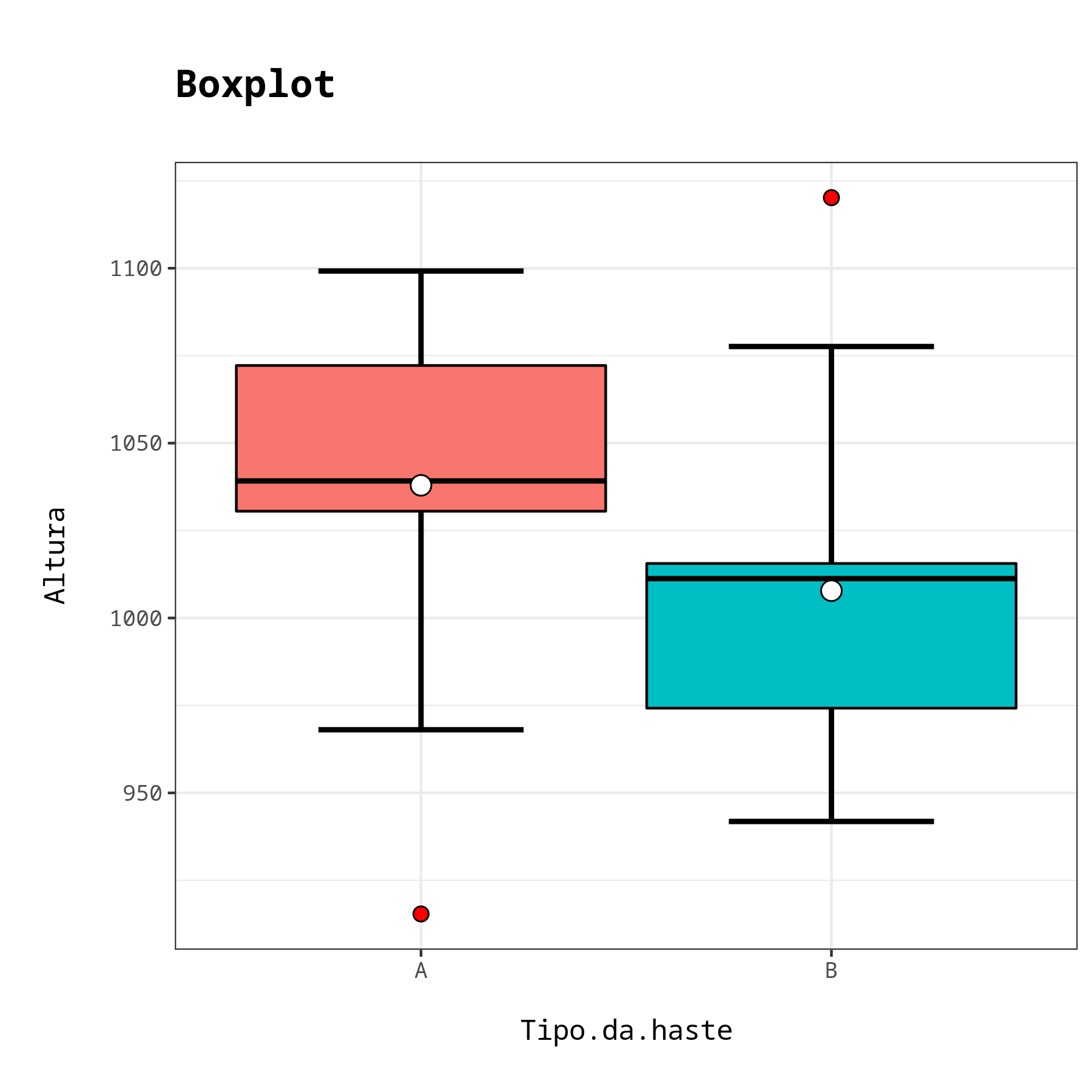 Ao compararmos os Boxplots dos dois tipos de hastes, vemos que estas se comportam de forma diferente com relação a suas alturas. Apesar de uma das hastes do tipo A ter uma altura com valor muito abaixo das alturas das hastes do tipo B, as hastes deste primeiro tipo possuem alturas bem superiores às do segundo tipo.