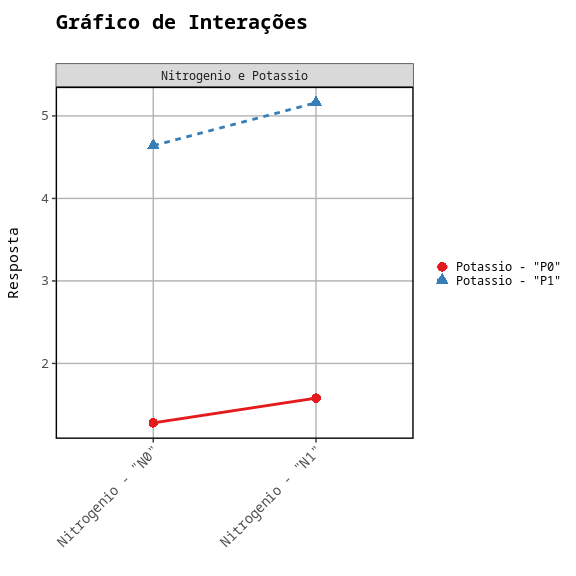 Observa-se que não há interação entre os dois fatores e seus respectivos níveis, ou seja, indicando independência entre eles. Portanto, independentemente do nível de nitrogênio a ser usado, N0 ou N1, o nível de potássio P1 sempre apresentará melhor resultado.