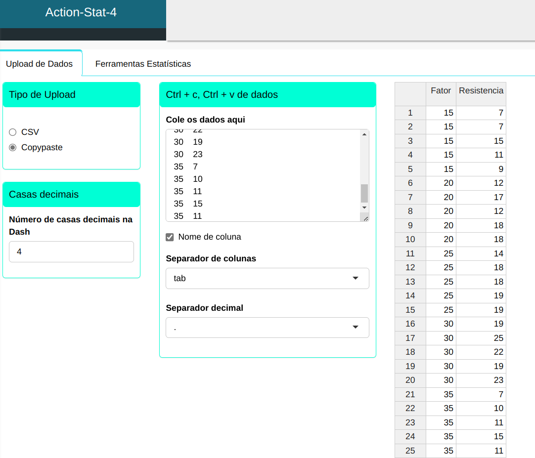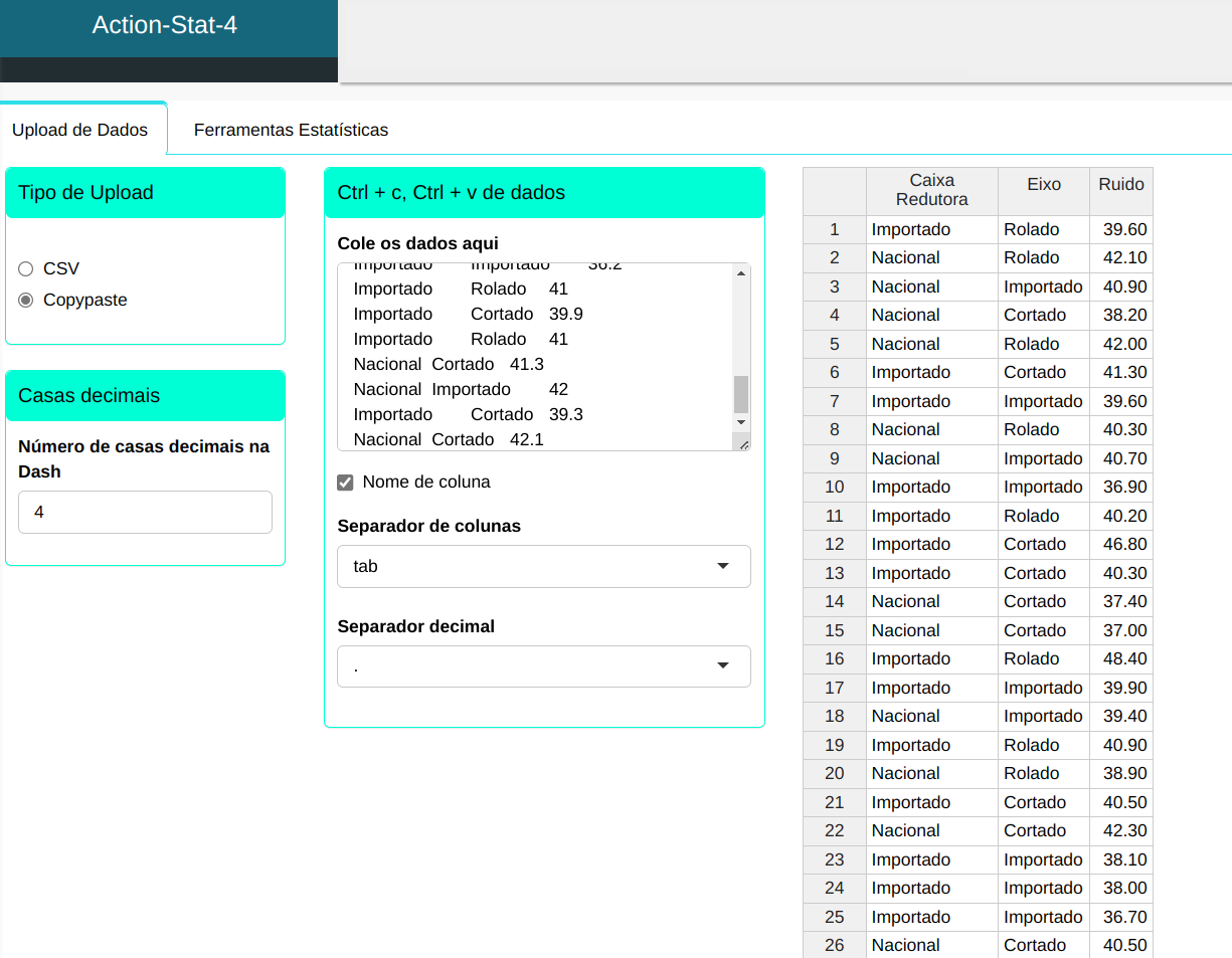 Consideremos um conjunto de dados com dois fatores (Caixa Redutora e Eixo) e vários níveis, conforme mostra a tabela a seguir.