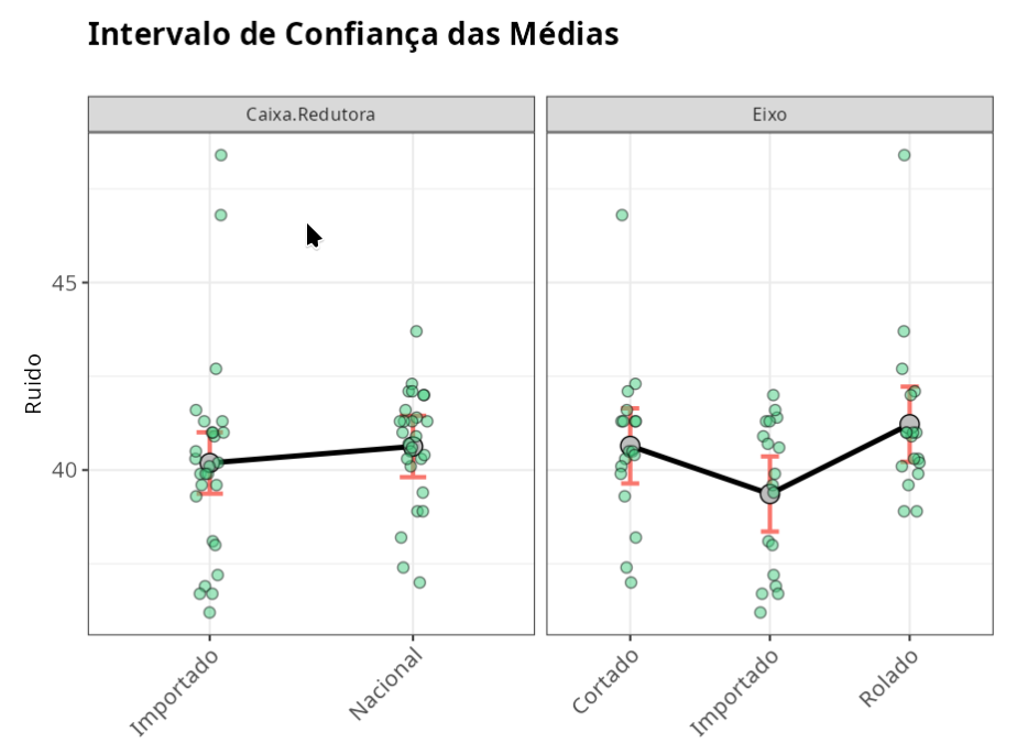 O gráfico, e a tabela apresentam a média de cada nível e os respectivos intervalos de confiança. Observa-se que, independentemente dos fatores e seus respectivos níveis, o ruído apresenta comportamento semelhante, com exceção de quando considera-se o eixo importado, situação em que o ruído, em média, diminui.